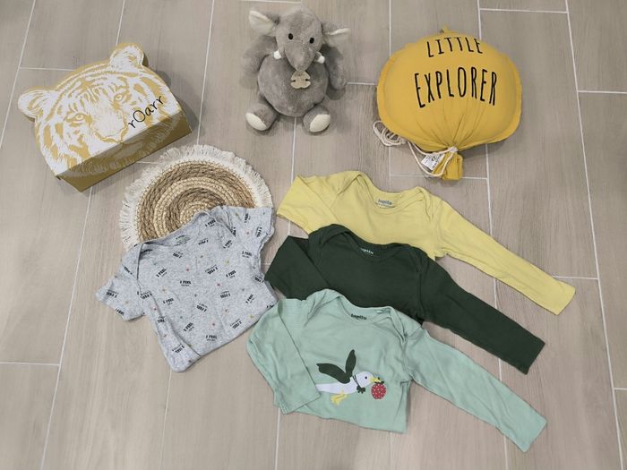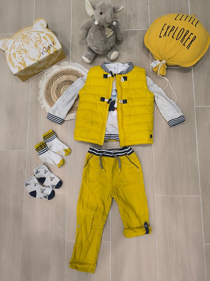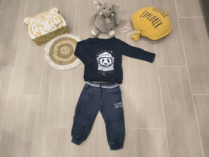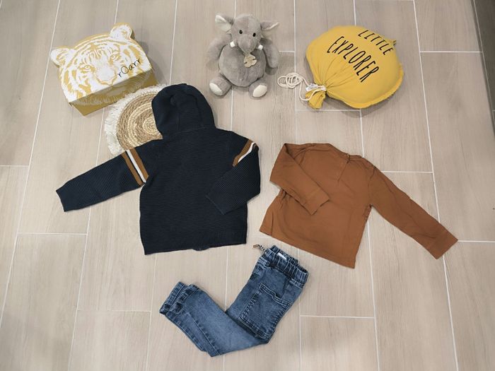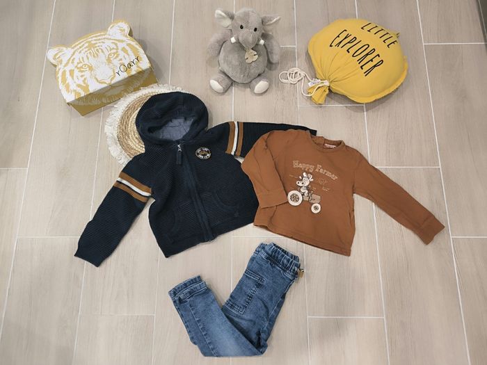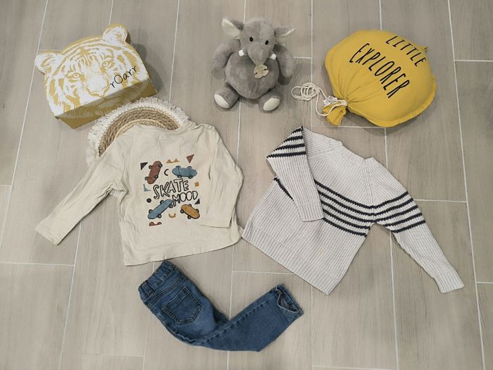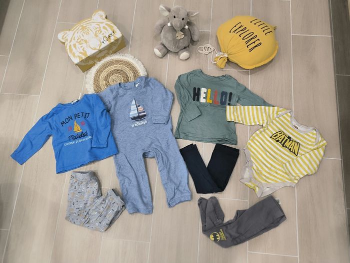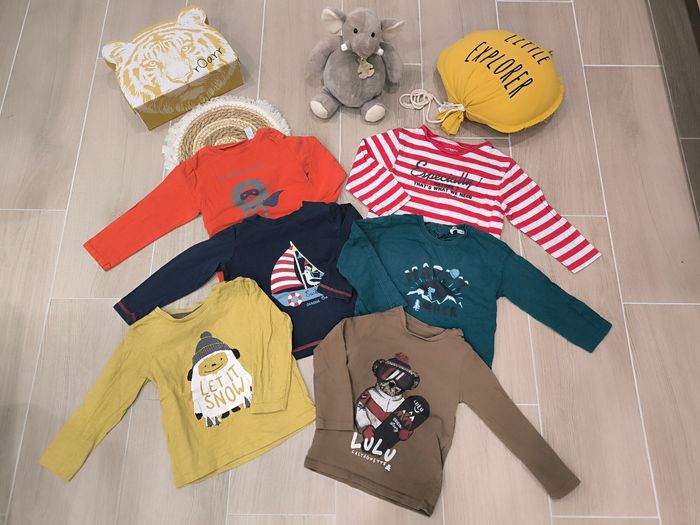 - 10 t-shirts manches longues (très bon état) - 3 bodys manches longues (très bon état) - 1 pantalon qui peut se transformer en pantacourt/short (très bon état) - 2 jeans (très bon état) - 1 jogging (très bon état) - 2 pyjamas coton pantalon et t-shirt manches longues (très bon état) - 1 pyjama body et pantalon pied anti dérapant Batman (bon état) - 1 pyjama 1 pièce sans pieds (très bon état) - 2 pulls (bon état) - 1 gilet à capuche avec fermeture éclair (très bon état) - 1 doudoune sans manches (très bon état) Donné avec le lot : chaussettes, boxers Marques : orchestra, Kiabi, Jacadi, Okaïdi, Gémo, Lulu Castagnette, Verbaudet etc ...