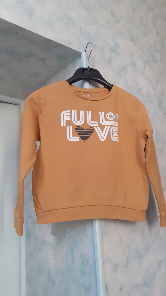Vends un sweat 100 % coton, molletonné, couleur moutarde avec inscriptions blanches devant, marque Kiabi écoconception, taille 8 ans sur l'étiquette mais court, 6 ans.