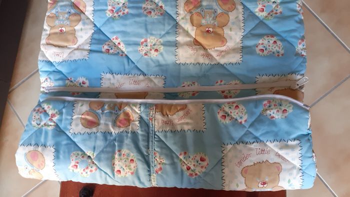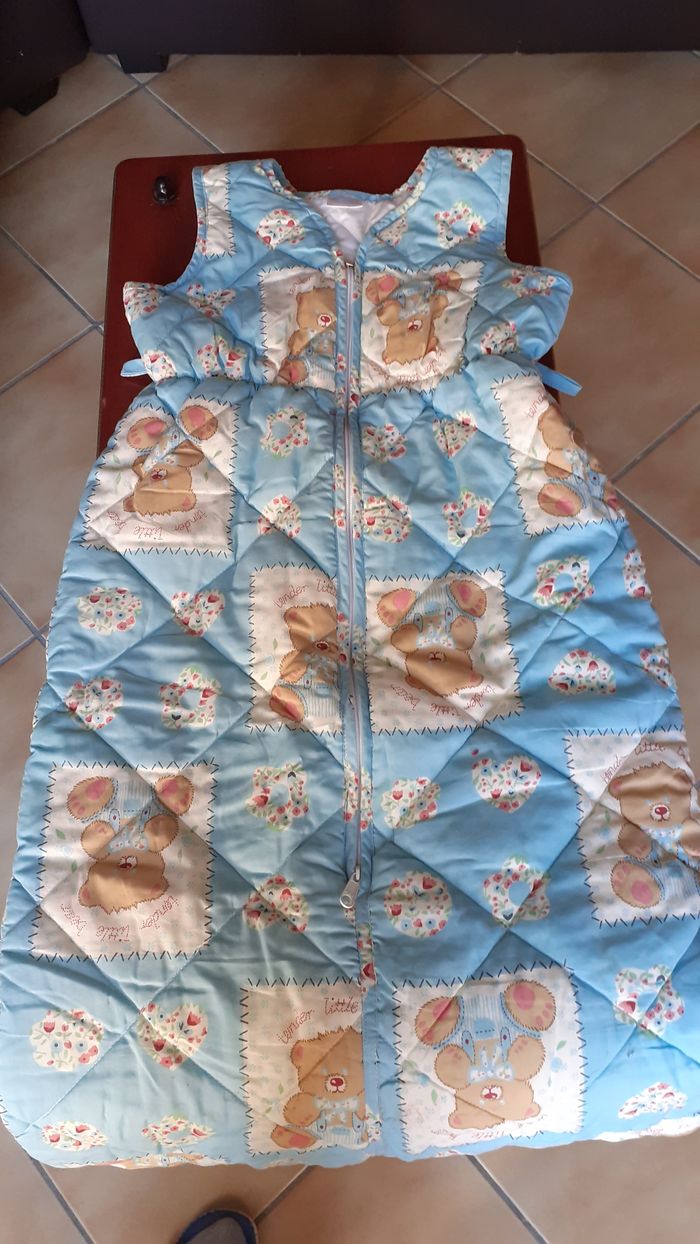 Vends une gigoteuse évolutive bien épaisse 65 % coton, 35 % polyester, matelassée, une fermeture éclair permet de la raccourcir selon la taille du bébé. Longueur totale : 103 cm Longueur repliée : 88 cm. A noter : l'élastique à la taille est un peu craquelé.