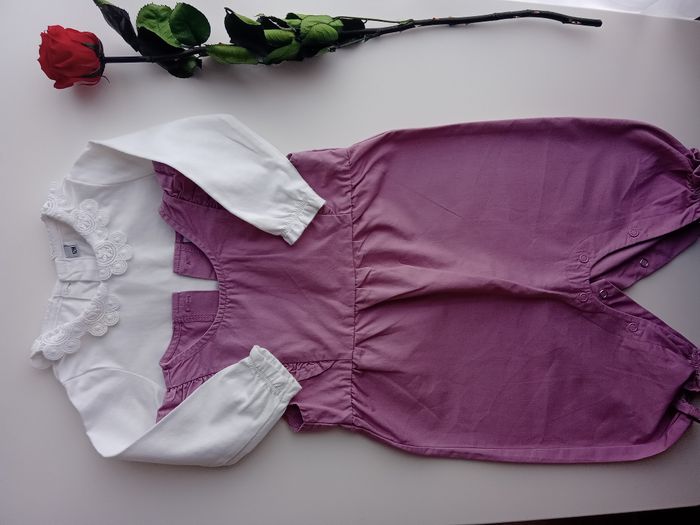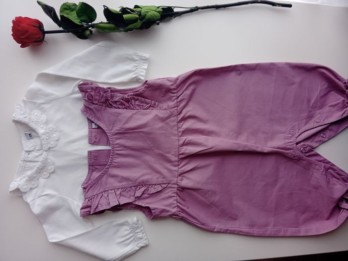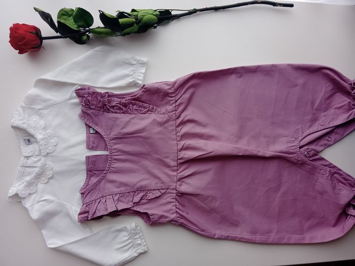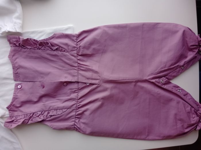 Magnifique ensemble salopette à boutonner au dos et son chemisier à manches longues avec un joli col, 100 % coton.😍❤️🎁🎉