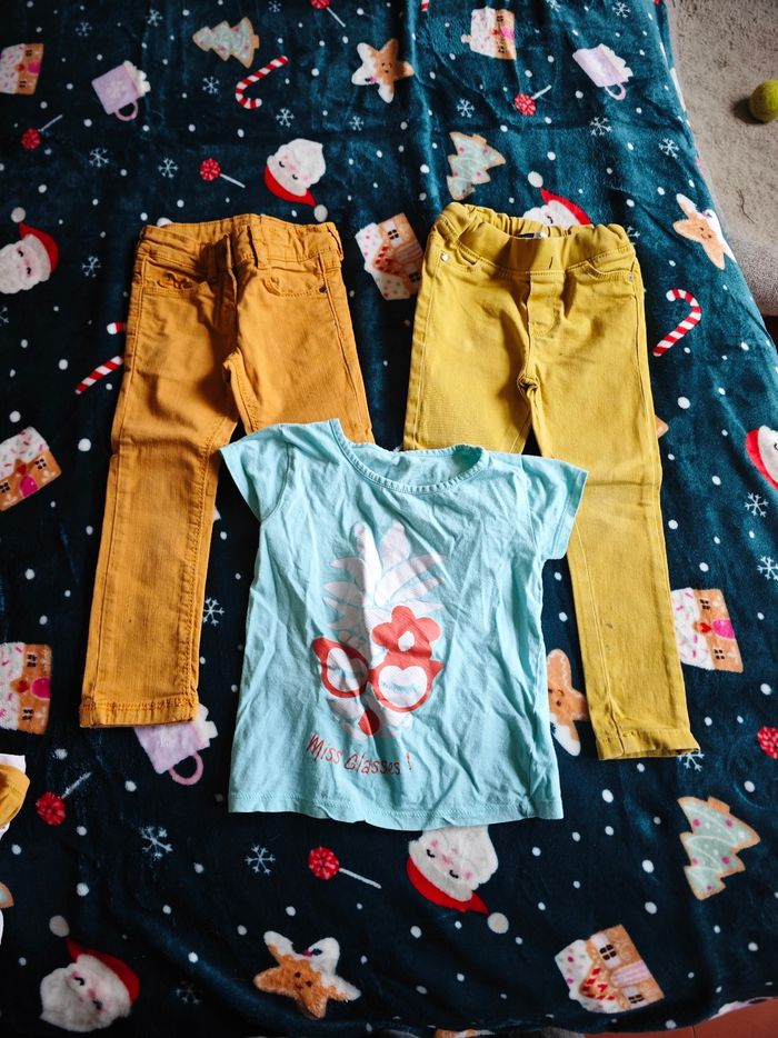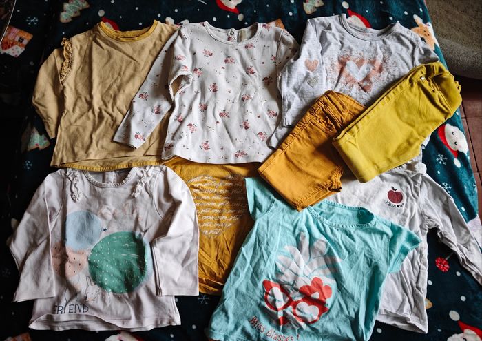 Lots de vêtements Le tee shirt est neuf le reste ont pas mal servi, mais peut encore dépanner. Aucun vêtements est troués, seulement de petites taches. Tout est sur les photos 2 pantalons 2 ans 6 Manches longues entre 23 et 24 mois 1 tee shirt 24 mois