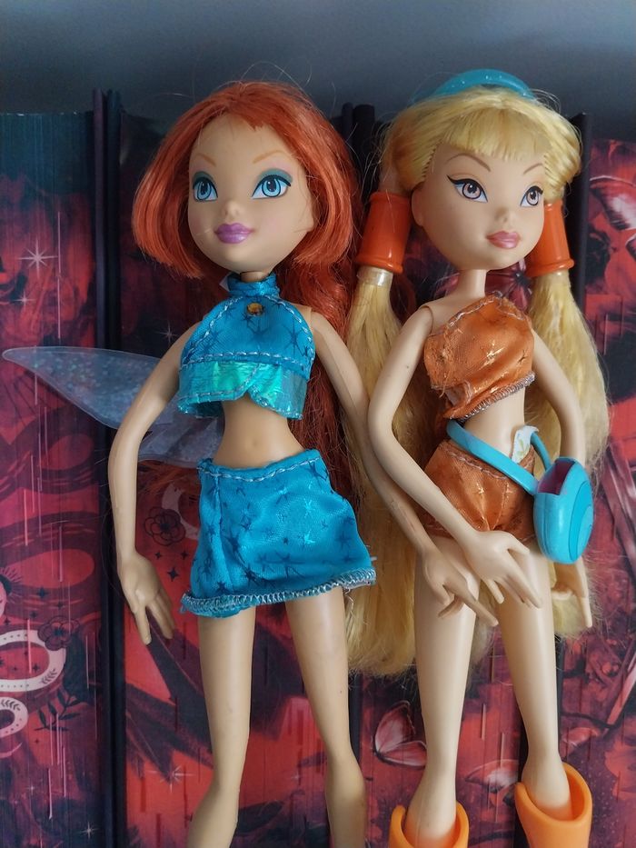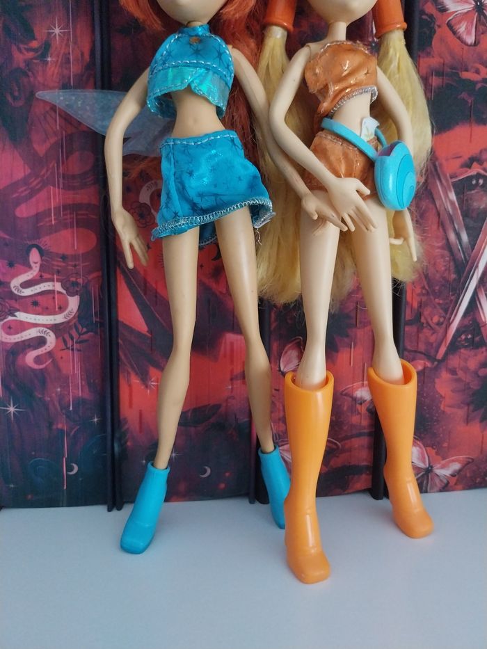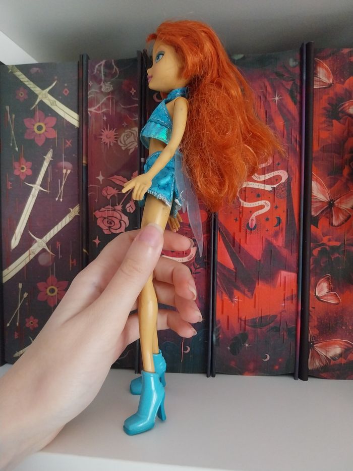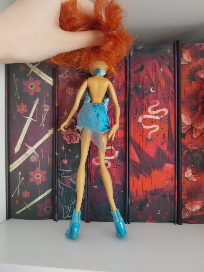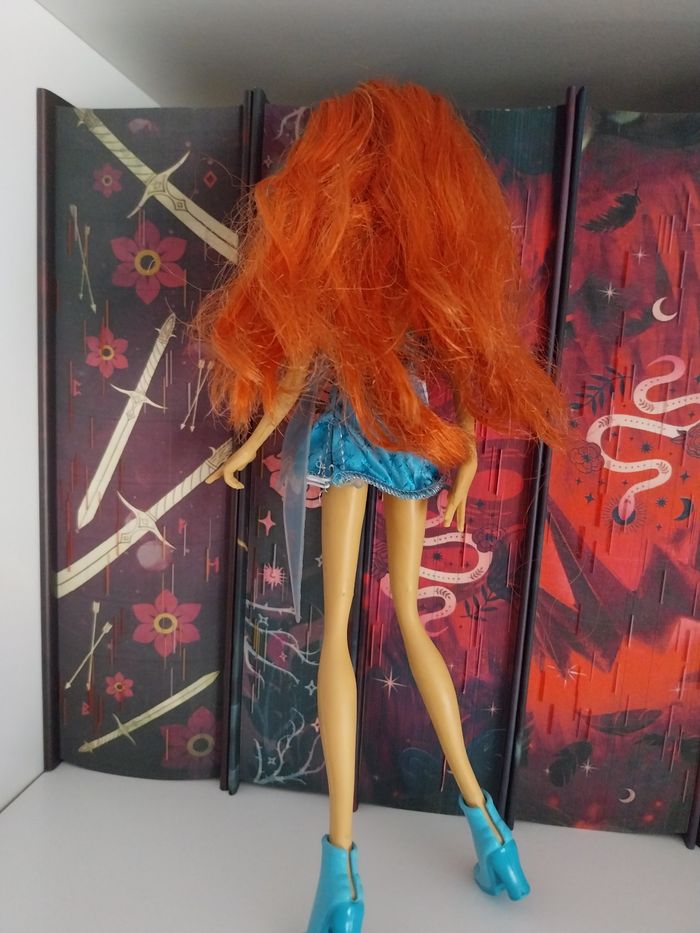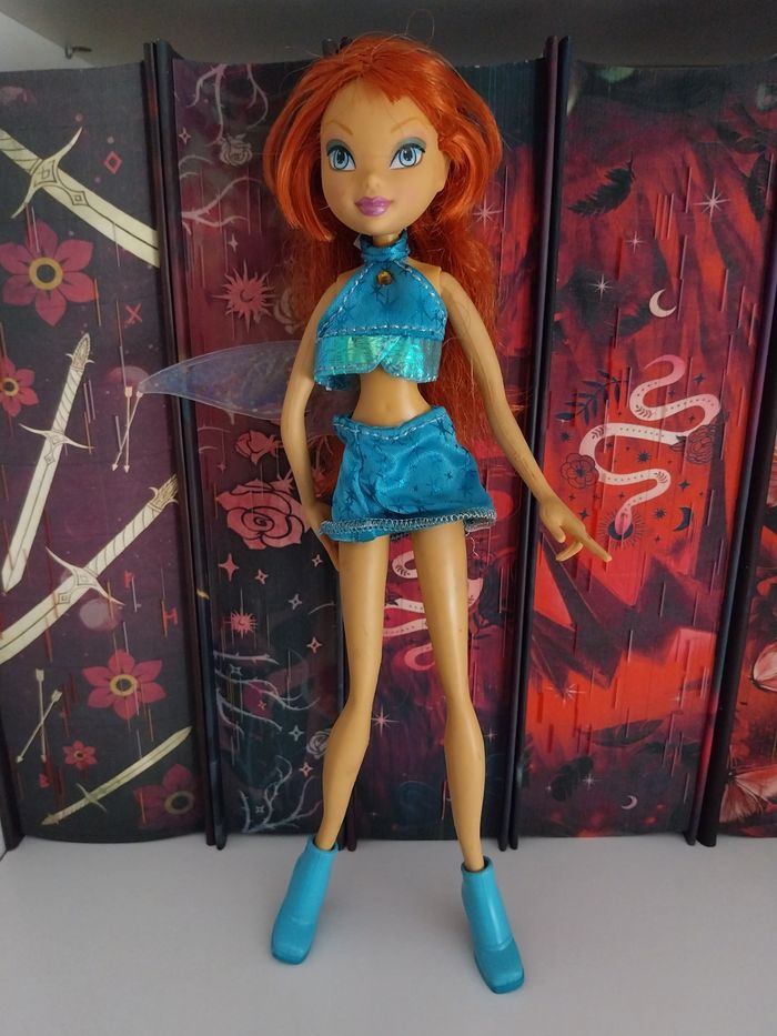 + Poupée Bloom avec tenue de fée Charmix, haut + jupe avec bottes. Une seule aile et elle est très fragile. Cheveux à repeigner. Bon état au niveau de la peau de la poupée. Les scratch ne fonctionnent plus vraiment.