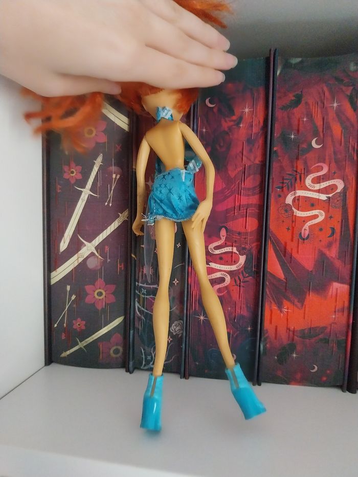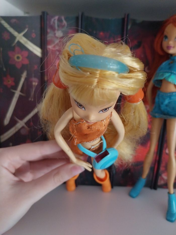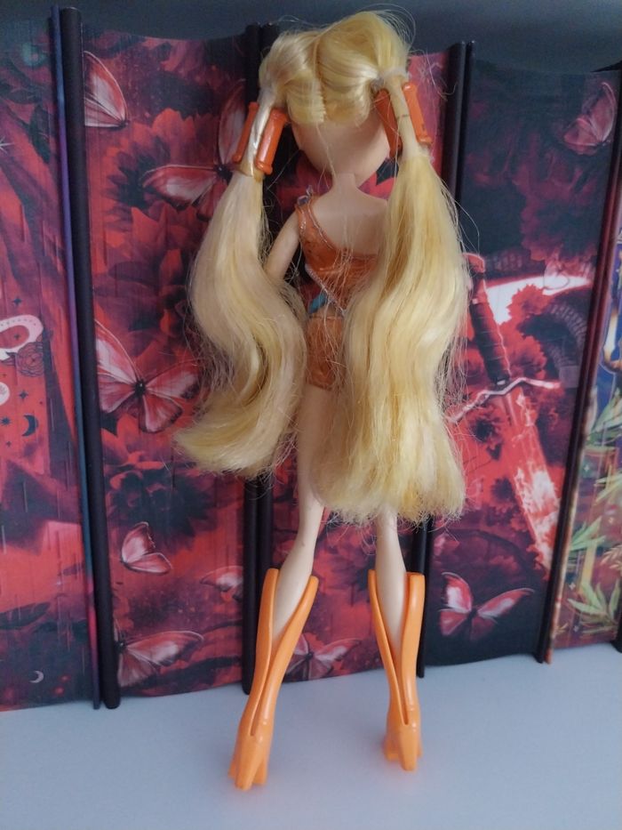 Poupée de la princesse Stella de Solaria. La poupée est dans sa tenue Charmix, avec le haut et le bas scintillants (qui a toujours son étiquette Winx). Elle a également ses bottes et son sac. Son serre-tête bleu est également présent et tient bien dans les cheveux, c'est juste qu'il s'est détaché des fils bleus présents sur les cheveux de la poupée mais il tient si on le fixe sur sa tête. Elle a également les deux "chouchous" retenant ses couettes, seulement ils ont un peu déteints sur les cheveux de Stella (sur une couette principalement, on le voit sur une photo). Merci de bien regarder l'état des vêtements, de la peau de la poupée et des cheveux de la poupée. Le tout est considéré comme étant en bon état.