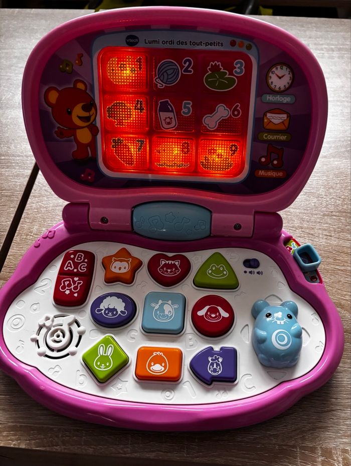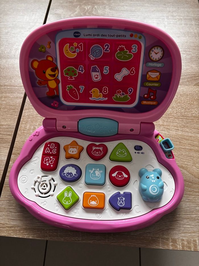 « Lumi ordi des tout-petits rose est le premier ordinateur de votre enfant pour faire le plein de découvertes en quelques clics dès son premier âge.