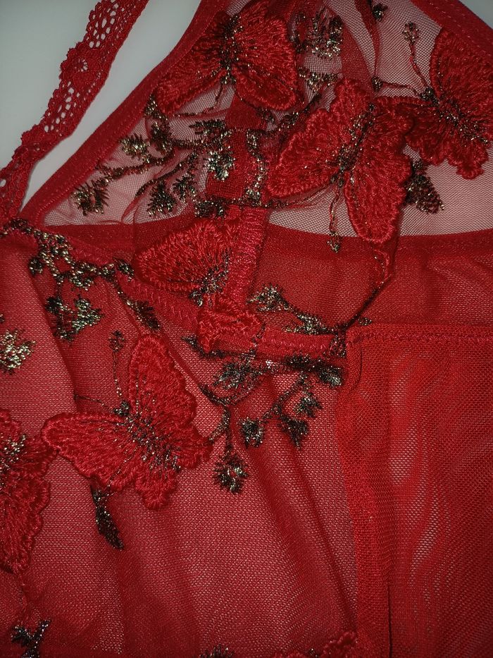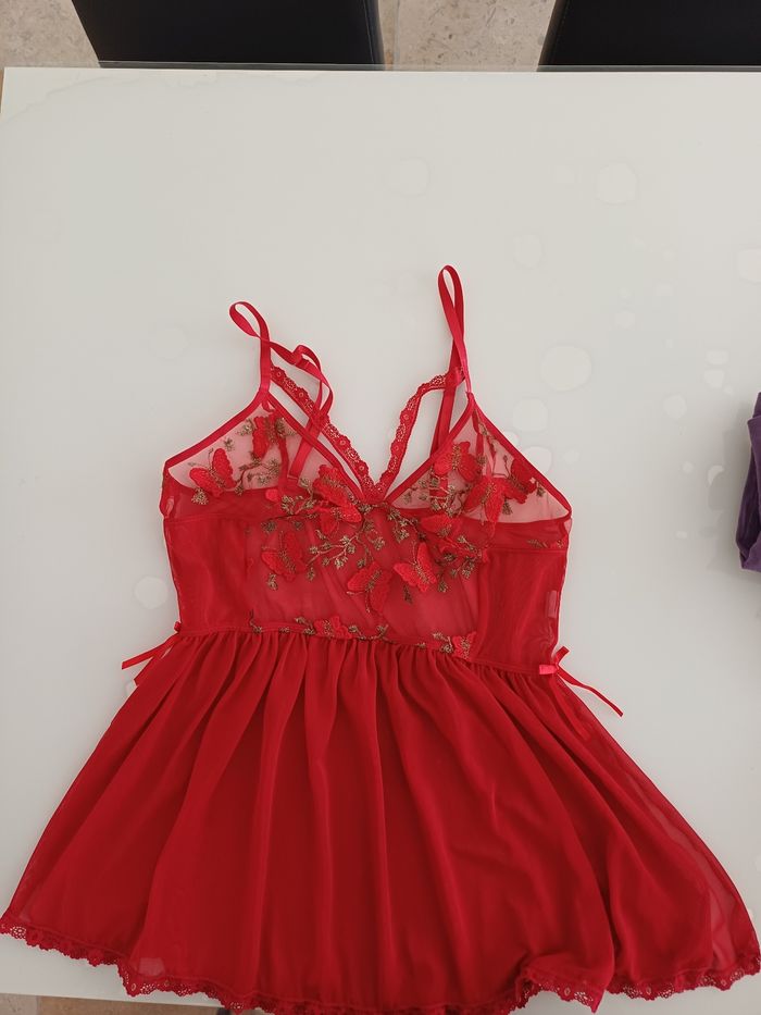 Tres jolie nuisette a hretelles de couleur rouge et gris argente. La taille est XL elle a des petits noeuds au niveau de la taille de chaque cote. Voir la photo ci jointe.