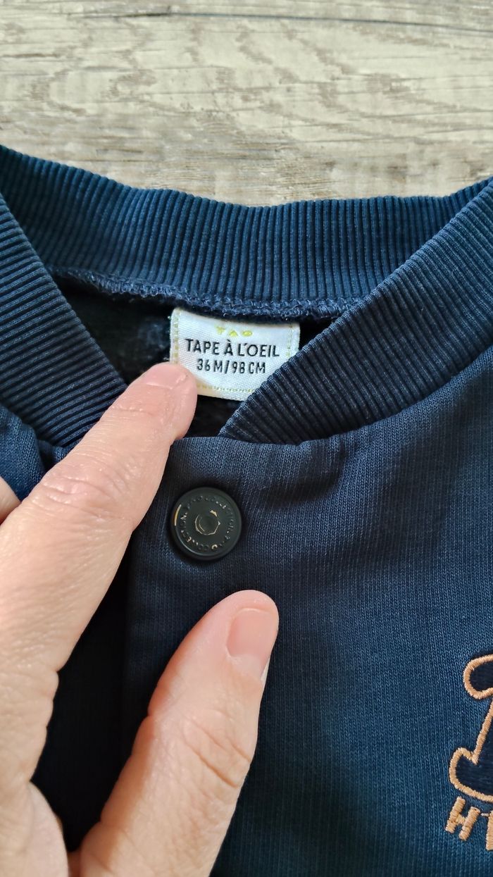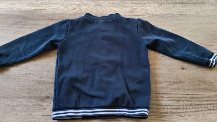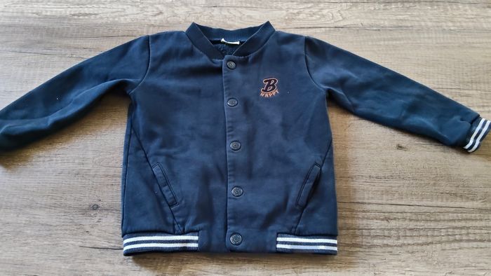 Veste (sweat) à pression, la couleur est due à la photo car elle n'a pas de défaut à ce niveau-là. Les seules marques sont sur les pressions, couleurs un peu retirées à certains endroits (cf. Photo).