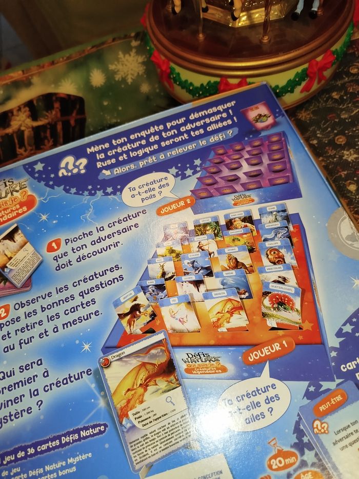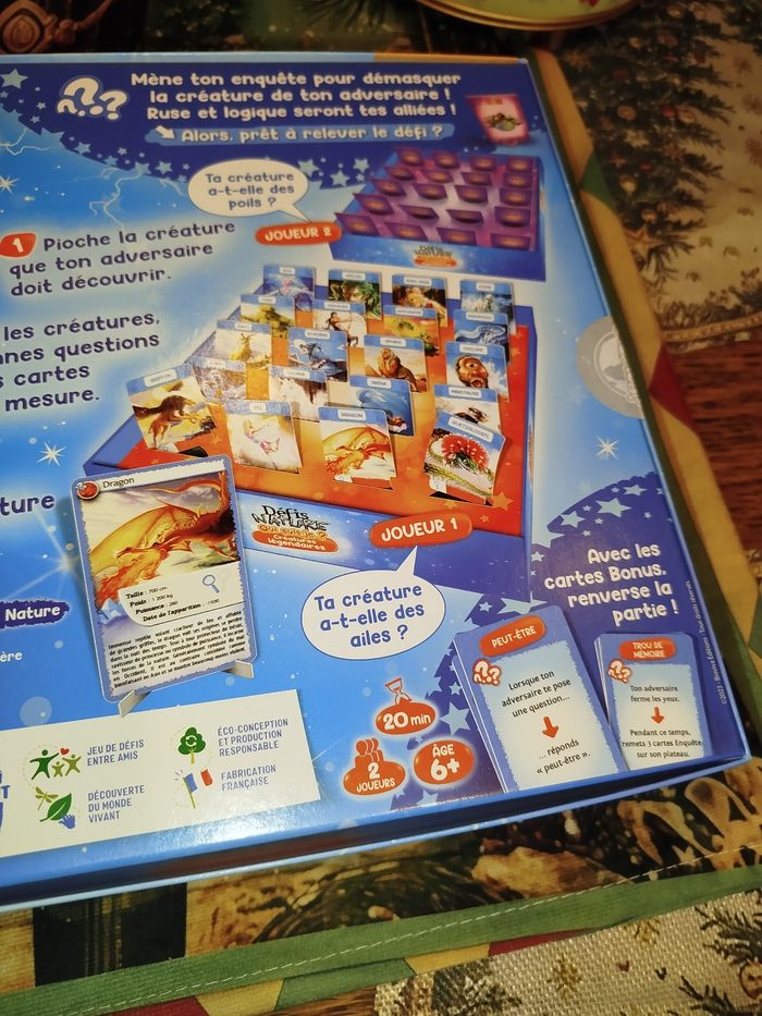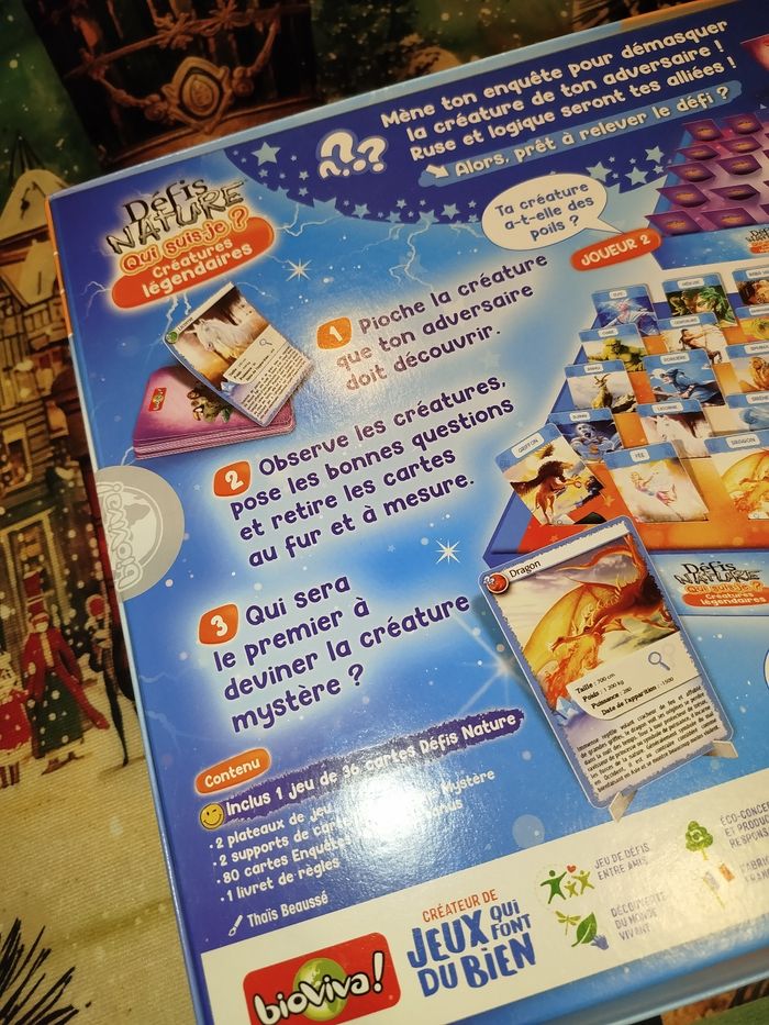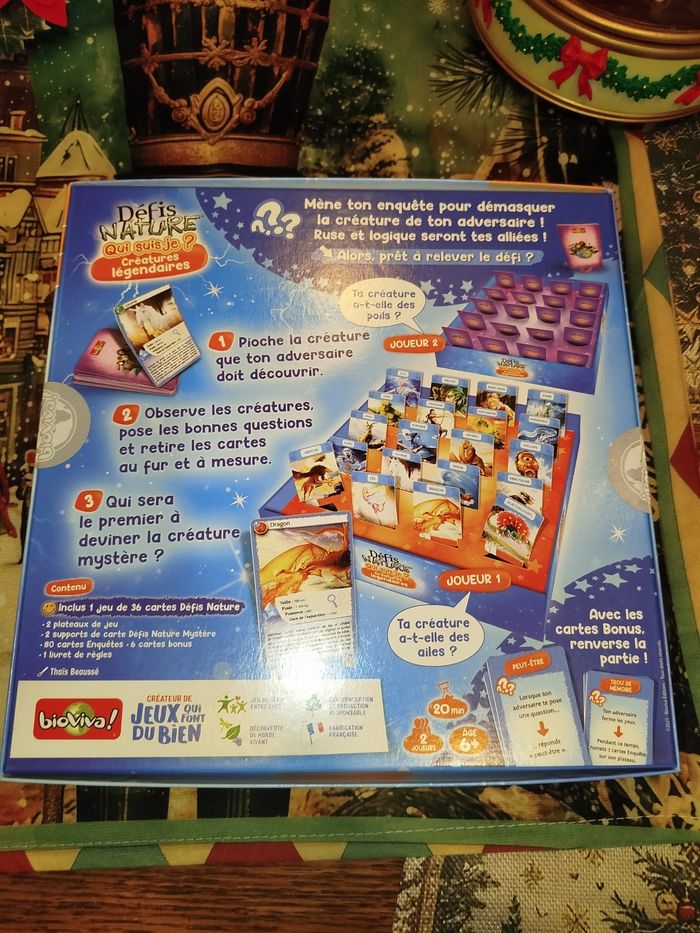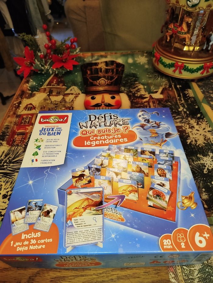 Qui suis-je ?Défis Nature – Créatures Légendaires 🎄✨ Défis Nature – Créatures Légendaires : le jeu parfait pour éviter d’offrir des chaussettes à Noël ! ✨🎄 Ho ho ho ! 🎅 Noël approche à la vitesse d’un dragon sous caféine, alors si tu cherches un cadeau fun, intelligent et pas trop gros pour rentrer sous le sapin, j’ai ce qu’il te faut ! Je vends le jeu Défis Nature – Qui suis-je ? Créatures légendaires, neuf, prêt à faire deviner dragons, griffons, yétis et autres bestioles mythiques à toute la famille. Idéal pour défier ton tonton (celui qui triche), ou pour épater la galerie avec ta culture mythologique ! 🧙‍♂️ Pourquoi l’acheter ? Parce que c’est neuf de chez neuf, jamais ouvert ! Parce que c’est super drôle, même quand on perd (enfin presque). Parce que ça change des puzzles de 5000 pièces que personne ne finit jamais. Parce que ça met 20 minutes… juste assez pour que les biscuits sortent du four. 🍪 🎁 Parfait pour un cadeau de Noël ! Avec son look magique et ses créatures légendaires, c’est le jeu rêvé pour un enfant, un ado, un adulte, un elfe ou même un chèvre-dragon (si si). 📦 Envoi rapide et soigné (promis, aucun dragon ne mâchouillera le colis).