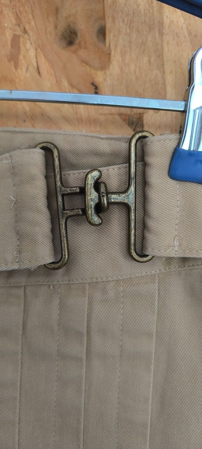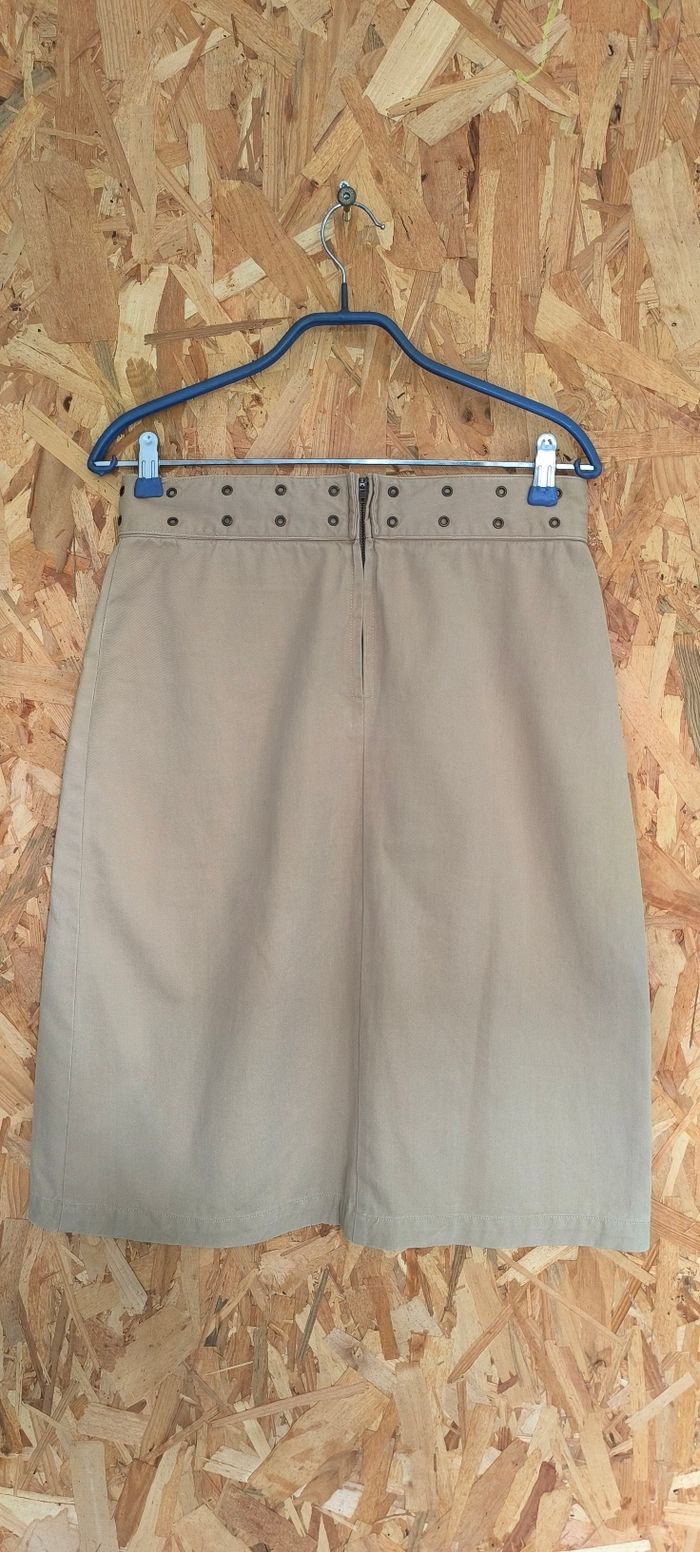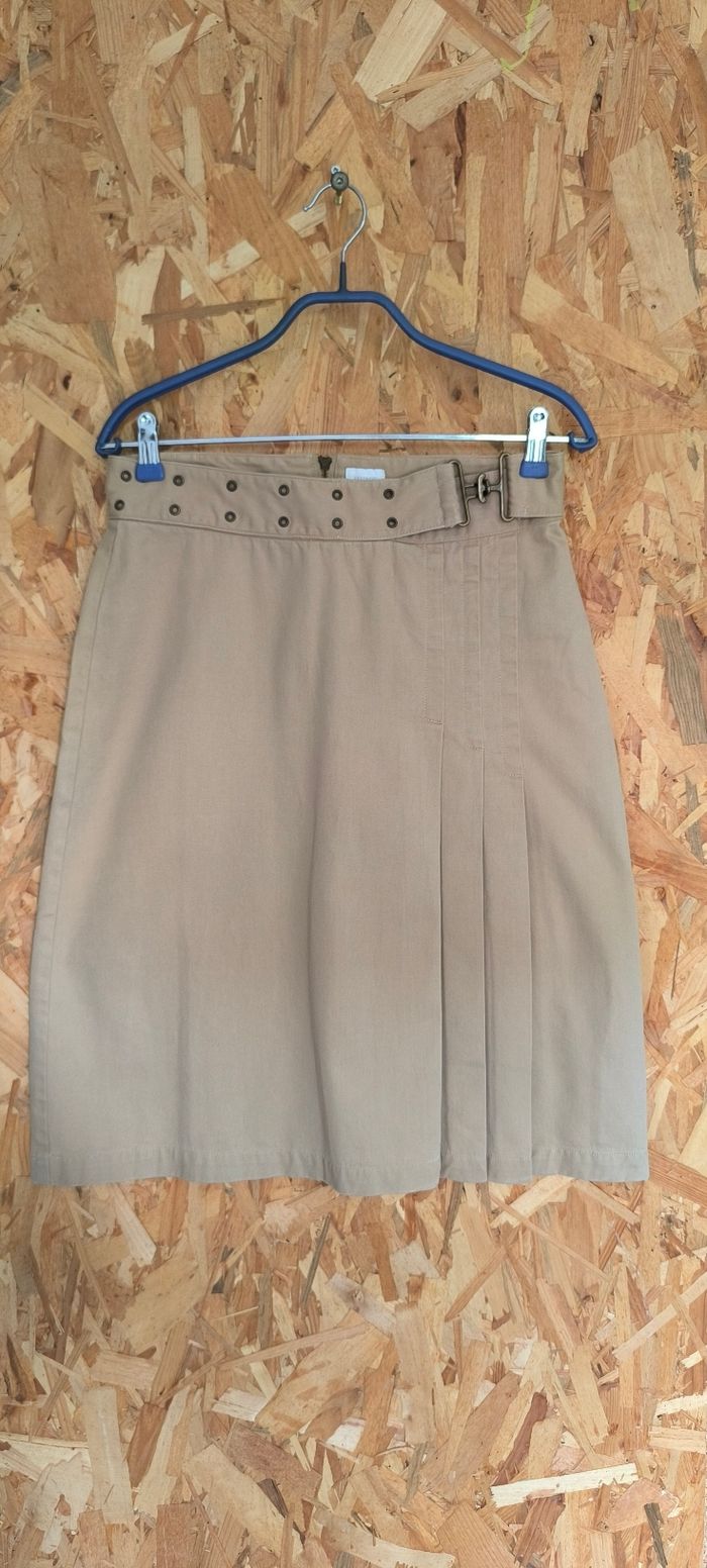 Jupe mi-longue Beige – Forme droite ou légèrement trapèze avec 3 plis plats latéraux (style kilt) sur le devant.