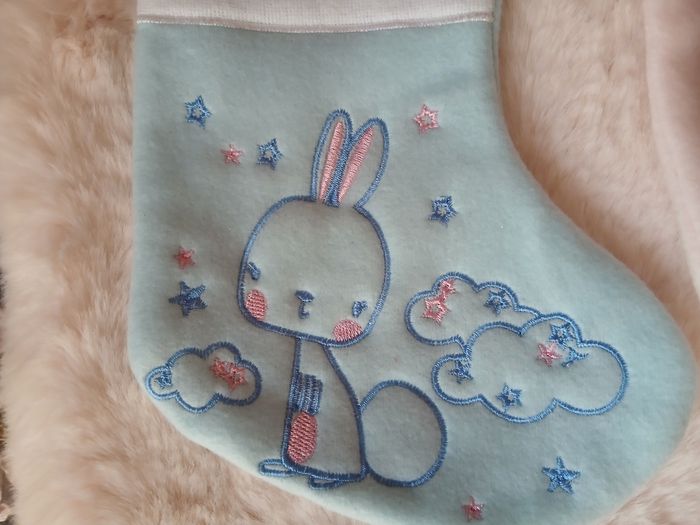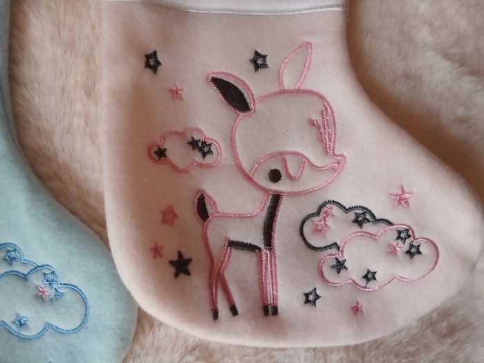 Articles neufs, encore étiquetés; marque Atmosphera. 1 chaussette fond bleu clair; motif "Petit Lapin" sur 1 face et dos uni + 1 chaussette fond rose pâle; motif "Petite Biche " sur 1 face et dos uni. Hauteur maxi de 22 cm // voir photos pour détails