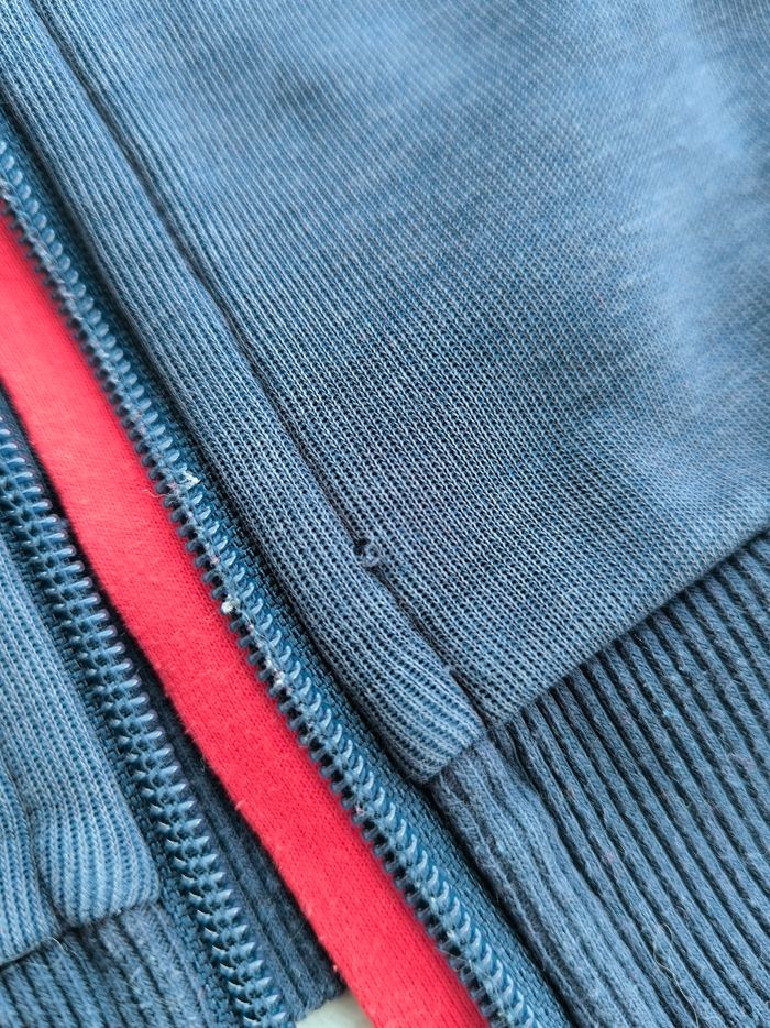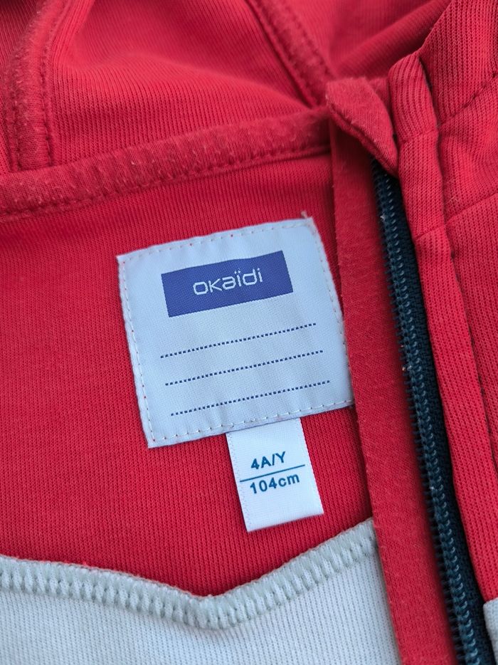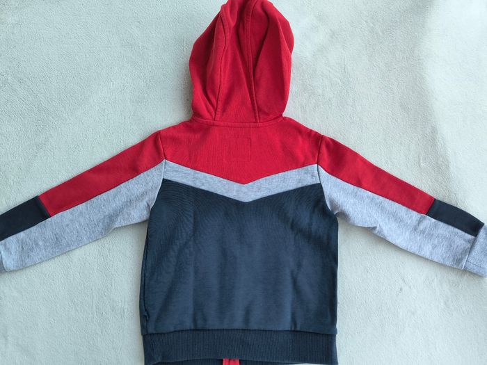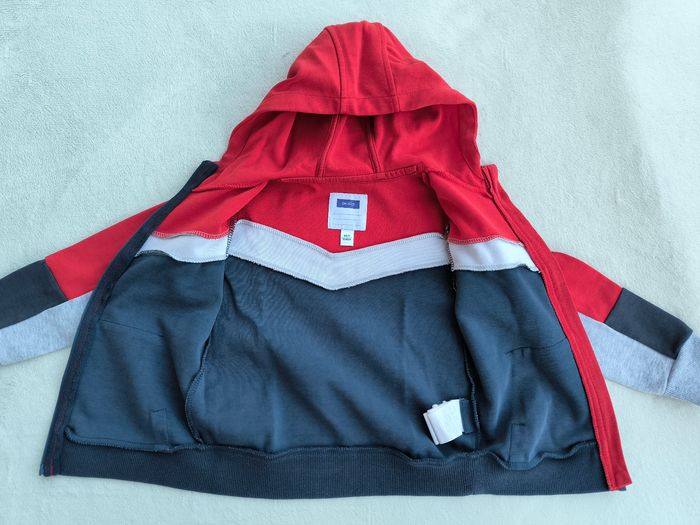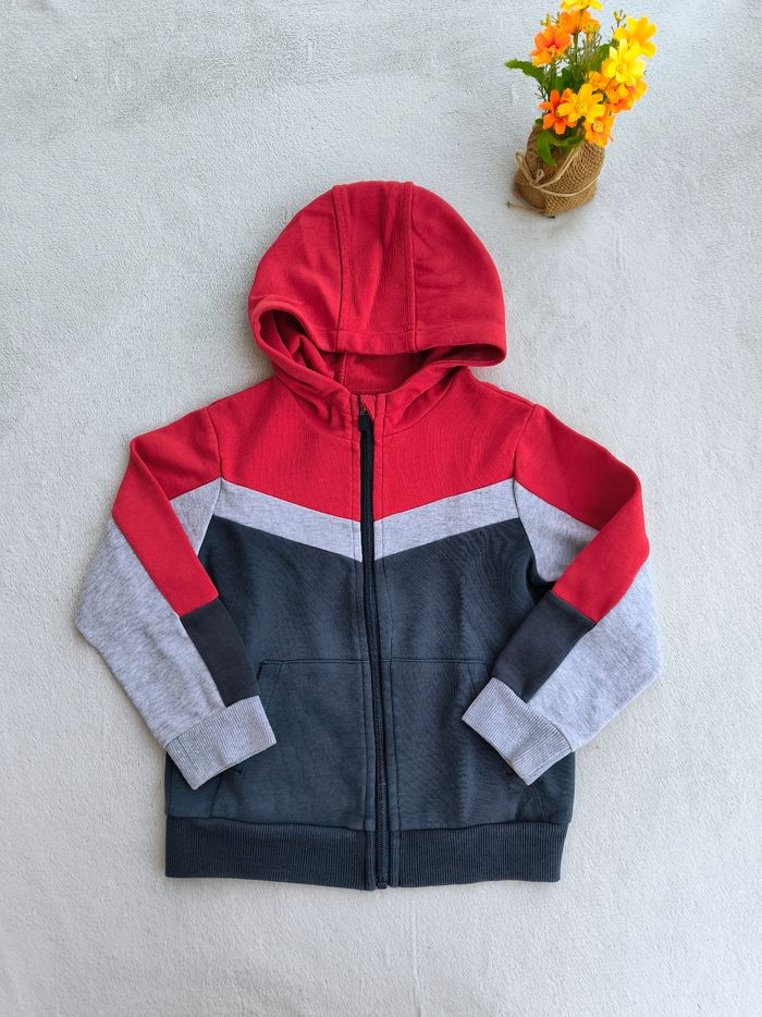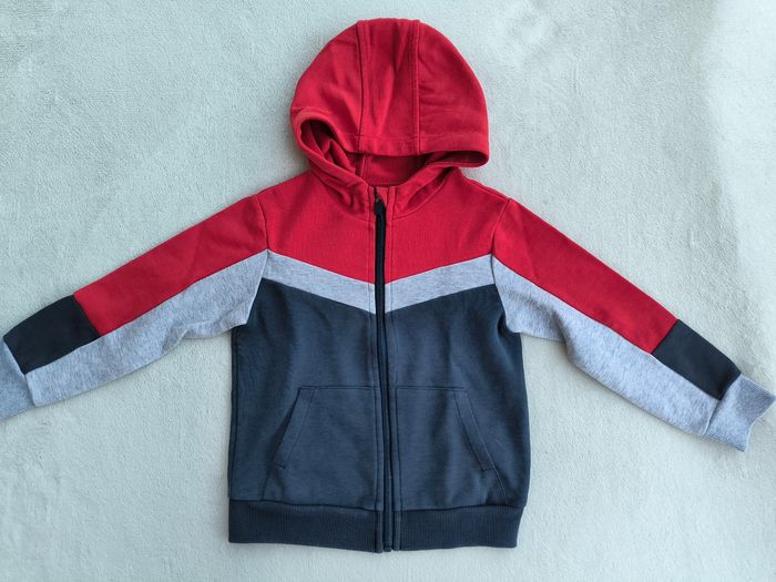 Gilet à capuche et à manches longues Marque Okaïdi Taille 4 ans, 104 cm • Coloris rouge, gris, marine • Fermeture par fermeture éclair • 2 poches • Coton fin • Petit accro sur le bas En très bon état #evelyne_garcons_4ans #evelyne_garcons