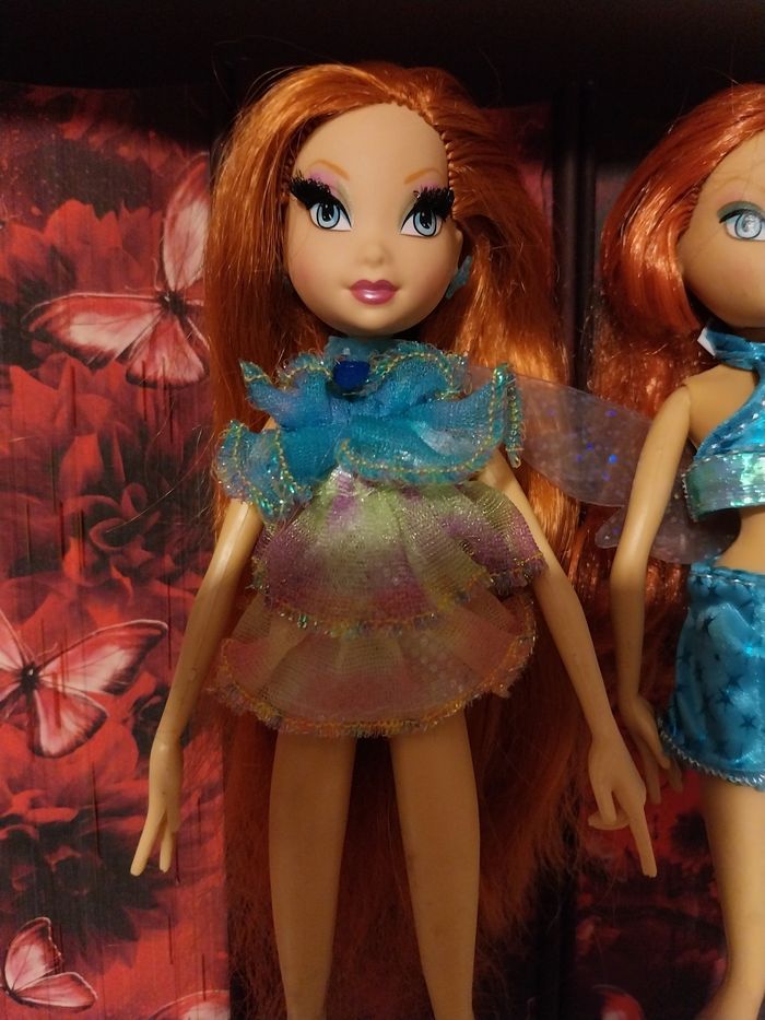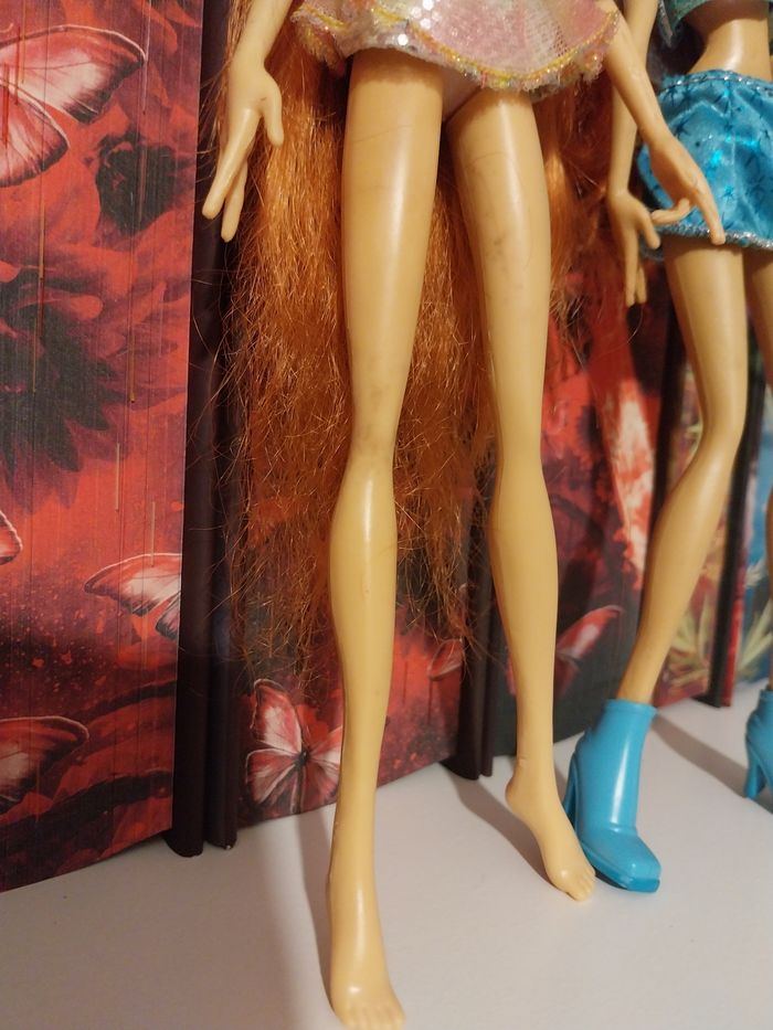 ☆ NON NÉGOCIABLE. NO BAJO EL PRECIO. NO OFFER. PREZZO NON TRATTABILE. ☆ Les photos sont à consulter attentivement et font office de description supplémentaire. N'hésitez pas à visiter mon dressing ☆ Je vends cette poupée Bloom Enchantix Glam Magic Mattel en l'état, bon état. Merci de bien regarder les cheveux, ils seront comme ceci. La poupée a ses boucles d'oreille, son collier, sa tenue et sa culotte. Je n'ai aucun autre accessoire malheureusement. Merci de bien regarder également l'état de la peau de la poupée, au niveau des jambes je n'ai pas tenté de faire partir les taches, aussi je ne sais pas si elles peuvent partir. + Poupée Bloom avec tenue de fée Charmix, haut + jupe avec bottes. Une seule aile et elle est très fragile. Cheveux à repeigner. Bon état au niveau de la peau de la poupée. Les scratch ne fonctionnent plus vraiment. Envoi rapide et soigné. Les deux poupées sont vendues ENSEMBLE. 105€ les 2