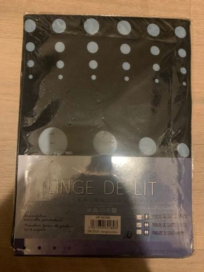 Linge de lit 2personne nouvelle génération micro fibre toucher peau de pêche résistant housse de couette 220/240cm et 2taie d’oreiller 63/63 couleur noir avec motif de rond en style relief strass voir photo neuf encore sous pochette