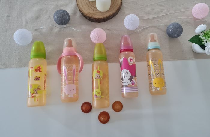 3 biberons de marque Tigex, + 2 avec motifs lapin / Minnie