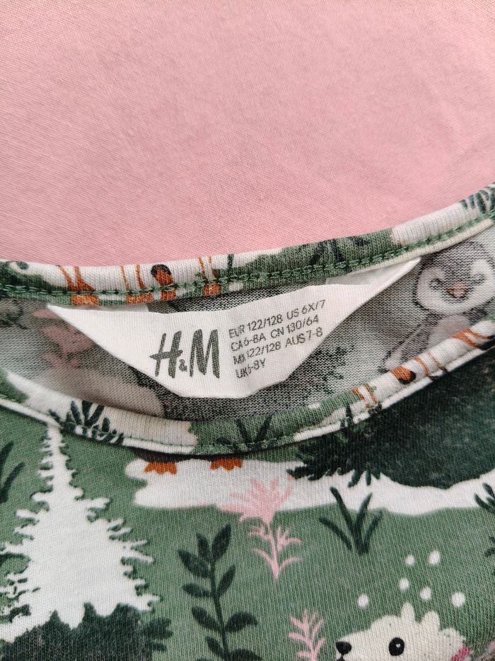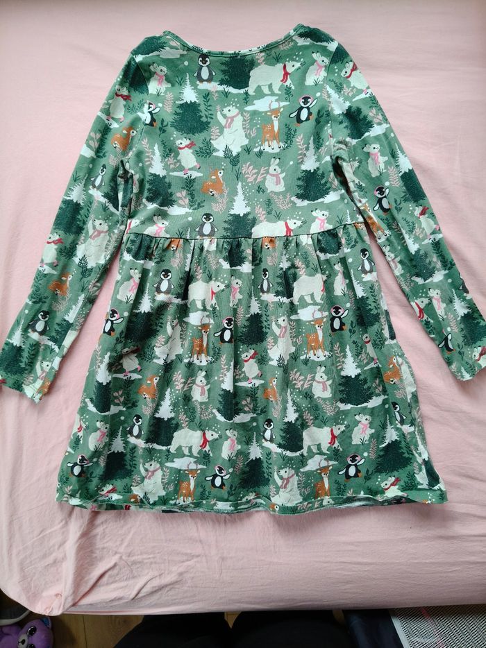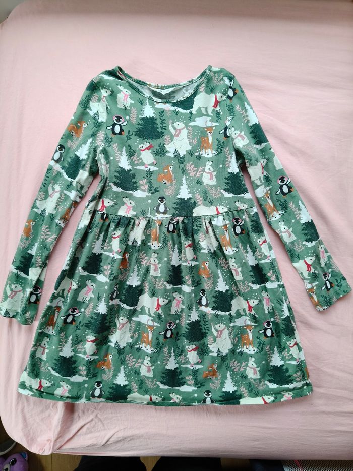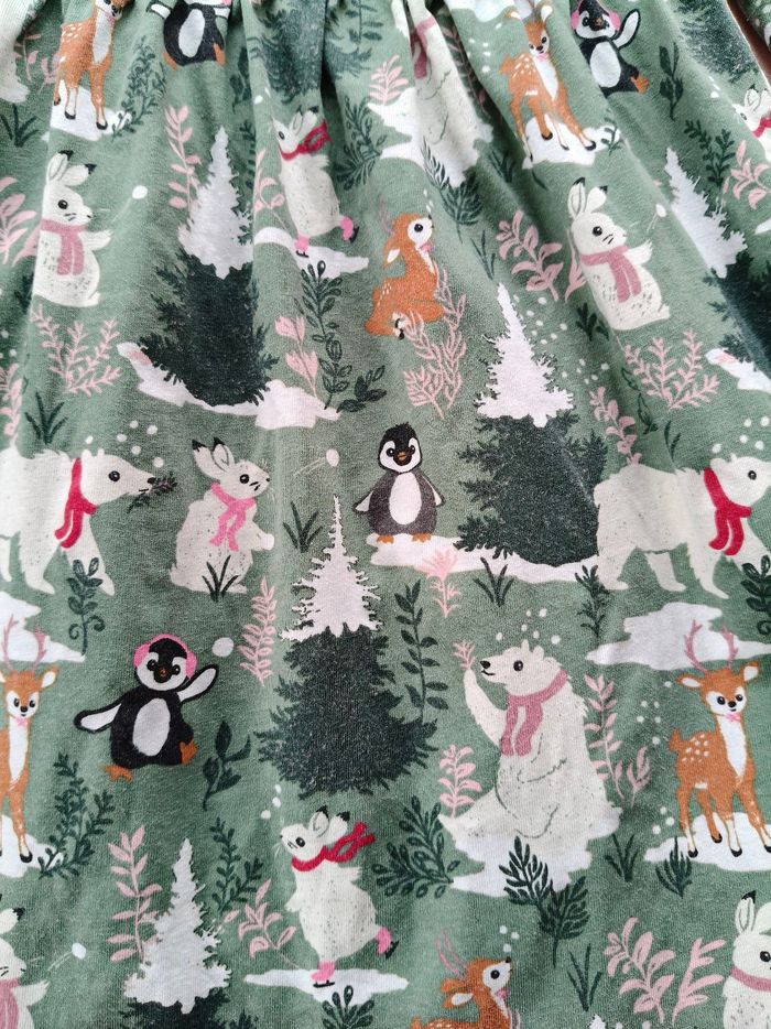 Robe manches longues avec joli motif d'hiver : plusieurs animaux sont représentés dans la nature : un pinguin avec un casue protège oreilles, un ours blanc avec écharpe rose, un lapin avec écharpe rouge qui fait du patin à glace, une biche, ... Il y a aussi des sapins enneigés et des plantes