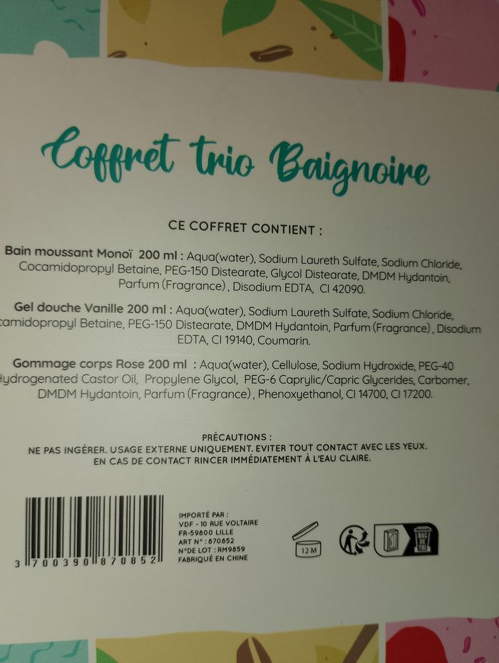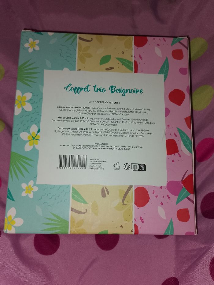 Coffret trio baignoire neuf 200ml bain moussant monoï 200ml gel douche vanille 200ml gommage corps rose Idéal pour offrir en cadeau Noël, anniversaire, sainte Catherine...