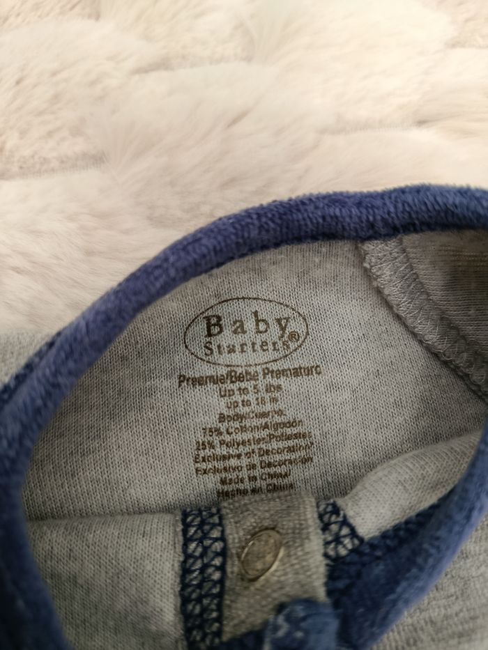 - Matière velours - Fermeture devant avec pressions - Couleur gris avec pieds et col bleus ainsi qu' une ligne bleue au niveau des pressions et des poignets - Larges bandes bleues et rouge au niveau des coudes - Imitation chaussure pour les pieds - Dessin ourson marron - Marque Baby starters - Aucune tâche ni trou