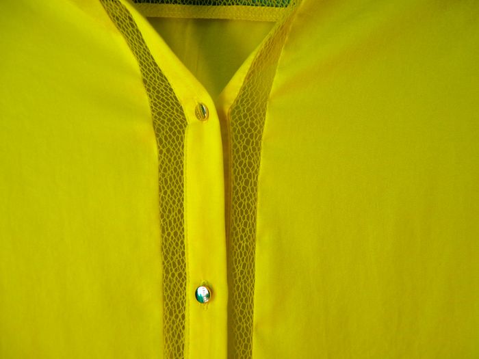 " Le Temps des Cerises " - LTC Modèle : Donella Chemise femme 36 ou S, TBE jaune avec un boutonnage soigné Jeu de matière ajourée au col et au boutonnage Dimensions épaules : 39 cm Longueur : 63 cm 100 % polyester envoi ok