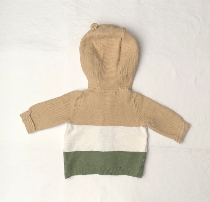 En maille point mousse de couleur beige, blanche et verte. Patchs tigre et ours.