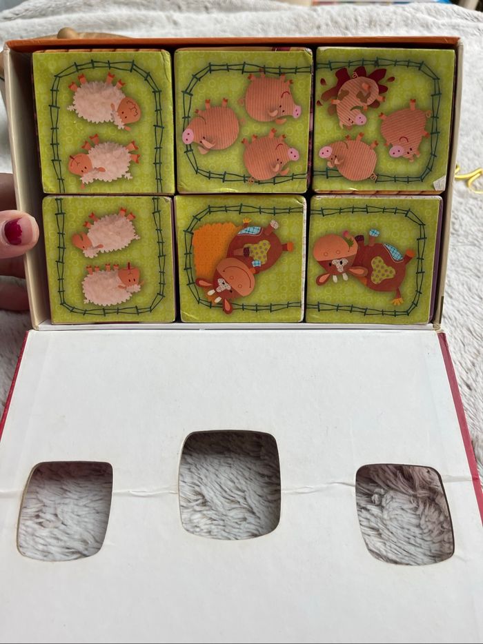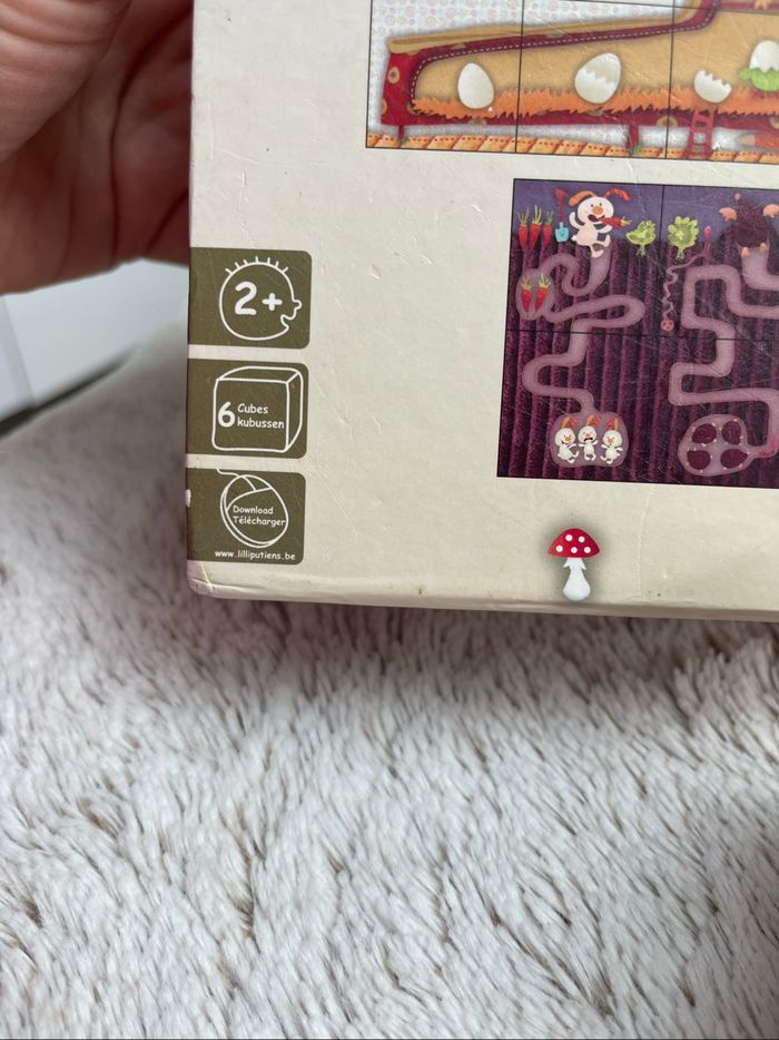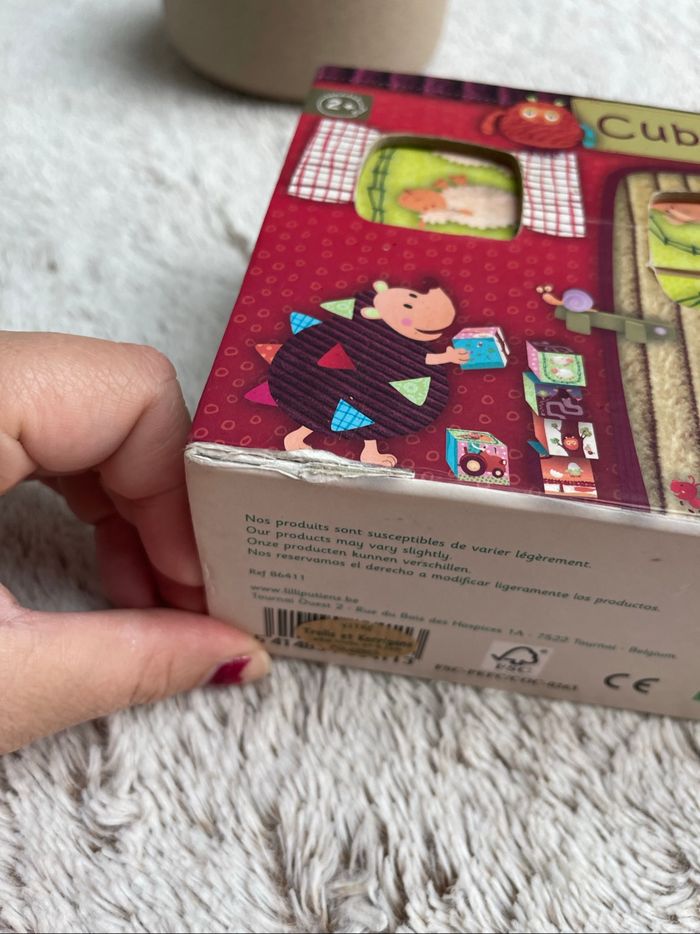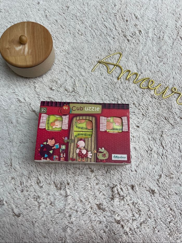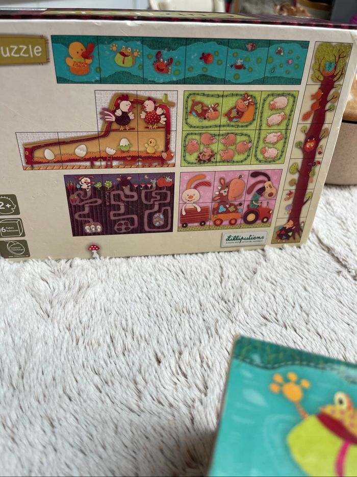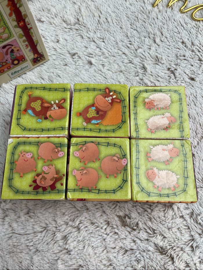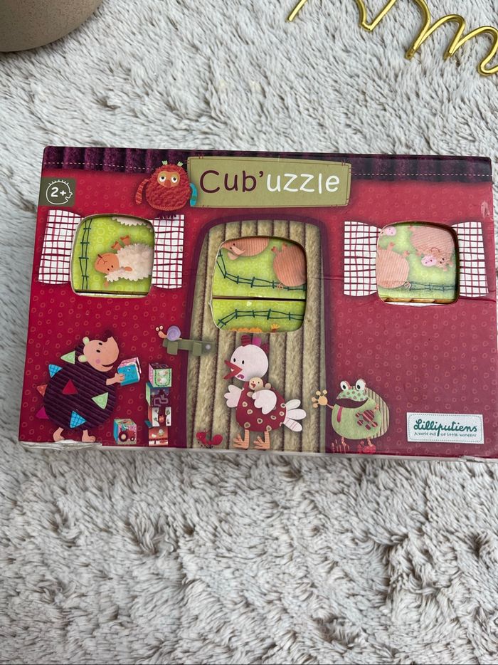 6 cubes cartonnés qui forment des puzzles lorsqu'ils sont assemblés. 6 types de puzzles, avec des formes différentes (largeur, hauteur, rectangulaire) Marque lilliputiens. Peu joué. Très bonne état