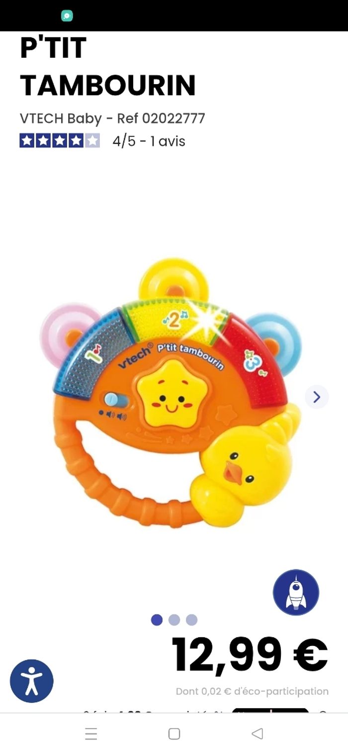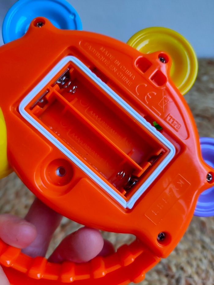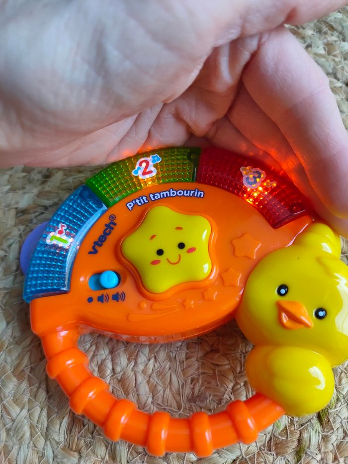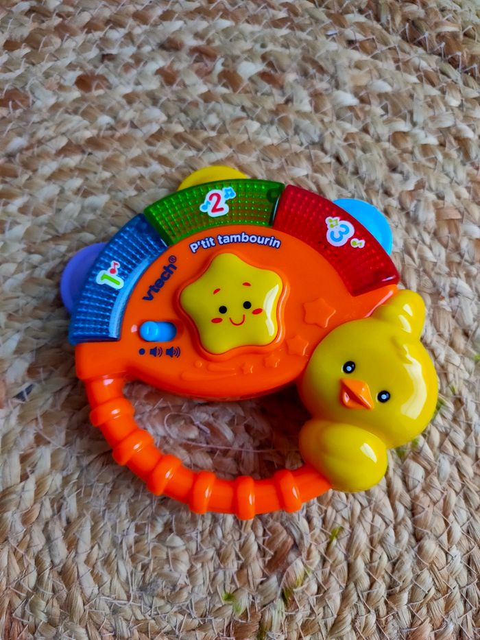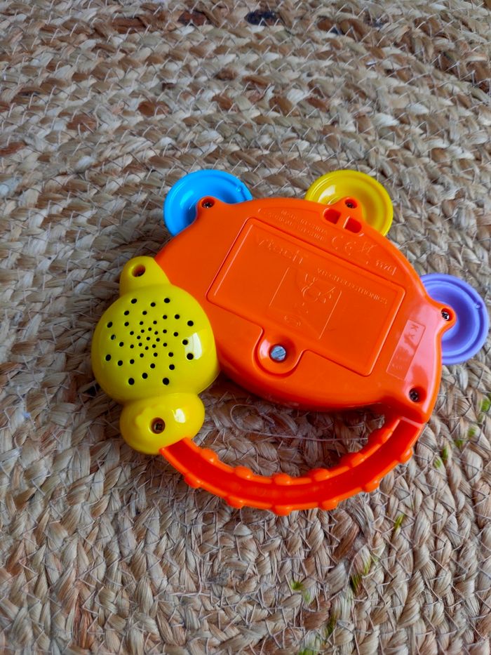 Cet hochet musical en forme de tambourin et son oiseau musicien vont amuser votre bébé pendant des heures de jeu. Il est en très bon état, sera vendu sans piles.