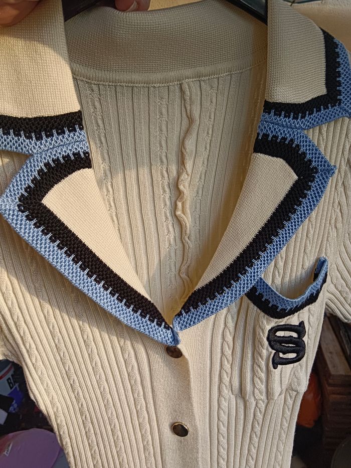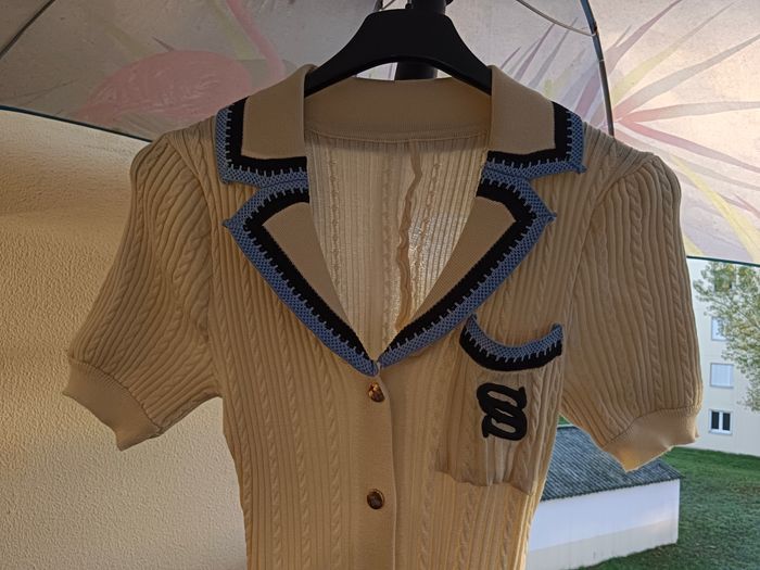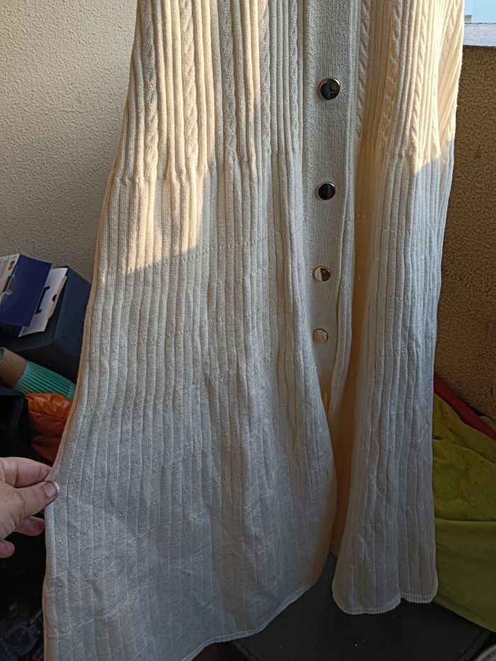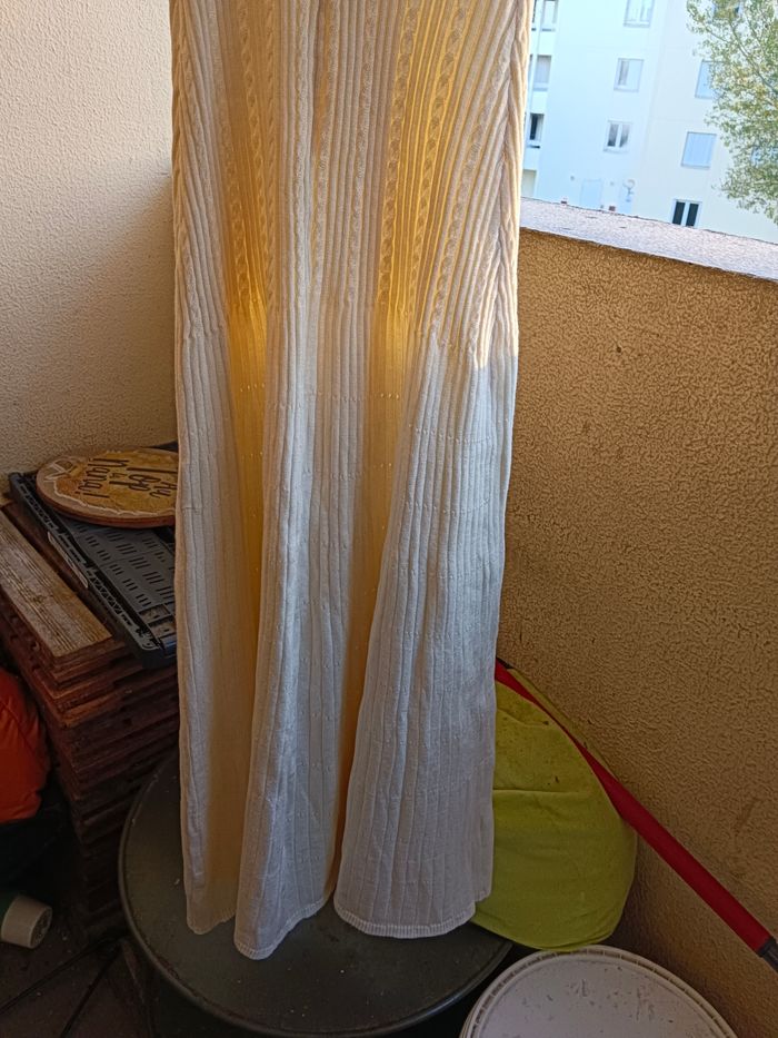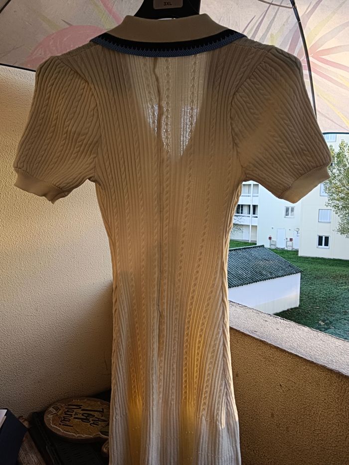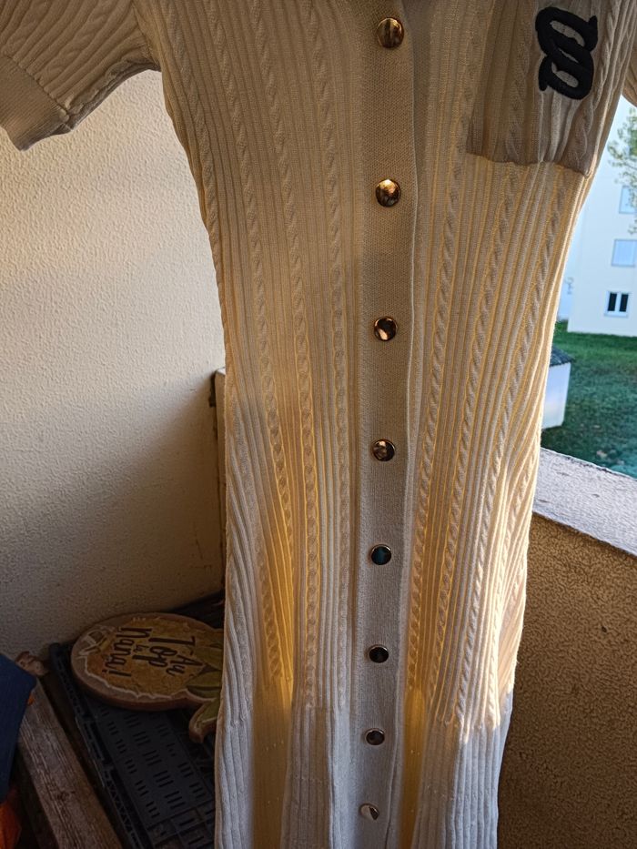 Robe longue en maille manche courte col V couleur crème a bouton qui s ouvre Robe droite sur le haut un peu évasé sur le bas excellente qualité taille 36 S jamais porté