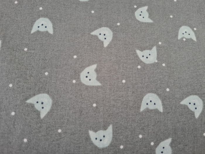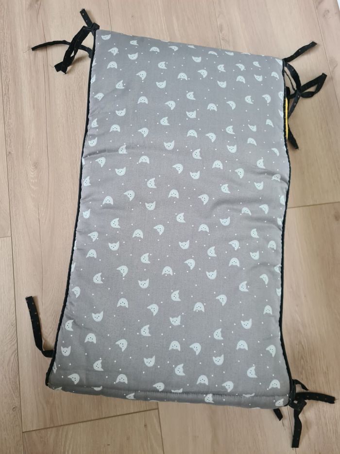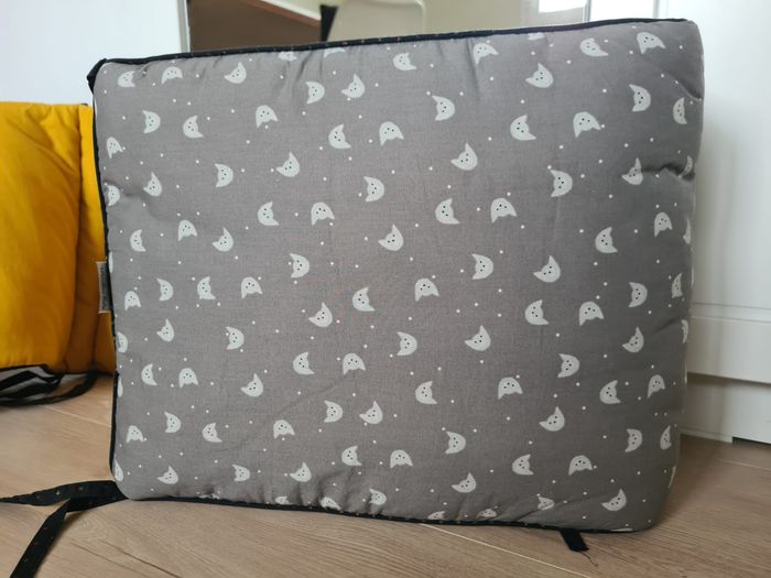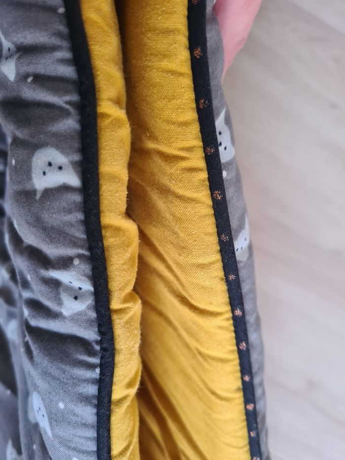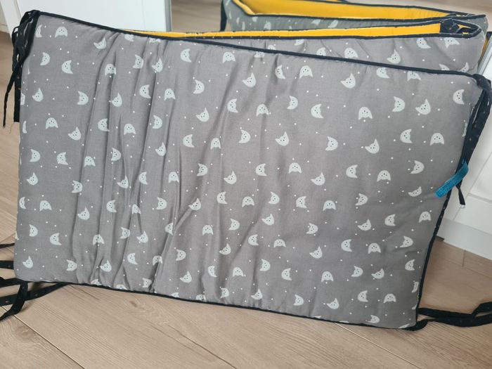 Tour de lit réversible : Un côté gris avec des têtes de chat - Un côté uni jaune moutarde