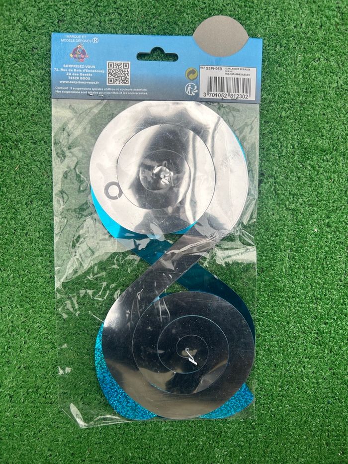 Lot de 3 guirlandes spirales métalliques « 50 ans », hauteur 60 cm. Idéal pour la décoration d’une fête d’anniversaire ou d’un jubilé. Les guirlandes sont encore neuves sous blister, prêtes à l’emploi et très brillantes, couleur principale bleu holographique, facile à suspendre.