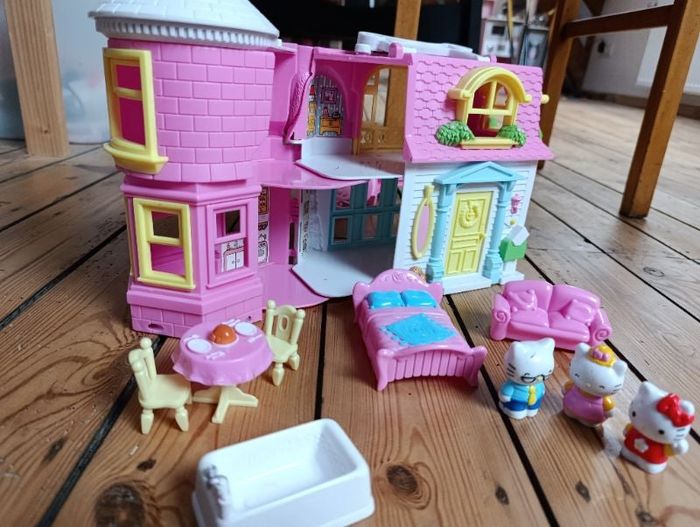 Maison de poupee Hello Kitty avec lit / table et 2 chaises / fauteuil et 3 personnages Un patte cassée au niveau du système d'ouverture de la maison (voir photo) qui n'a aucune incidence sur l'utilisation