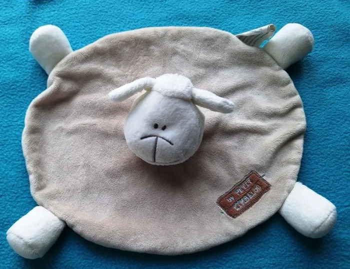 DOUDOU ROND PLAT MOUTON EN VELOURS BEIGE ET BLANC AU CENTRE DU DOUDOU, MOUTON BLANC AVEC SES 4 PATTES QUI SORTENT DU DOUDOU SUR LE BAS DU DOUDOU, ETIQUETTE BRUNE AVEC BY PETIT KIMBALOO BRODE DESSUS ETAT PARFAIT !