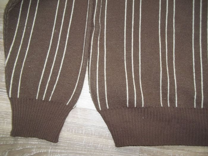Pull vintage marron avec fines rayures blanches, 100 % acrylique, col "polo" fermé par 3 boutons. Un peu bouloché et restent quelques petites traces. Longueur 68 cm, manches 61 cm, largeur épaules 47 cm, aisselles 56 cm. J-XL