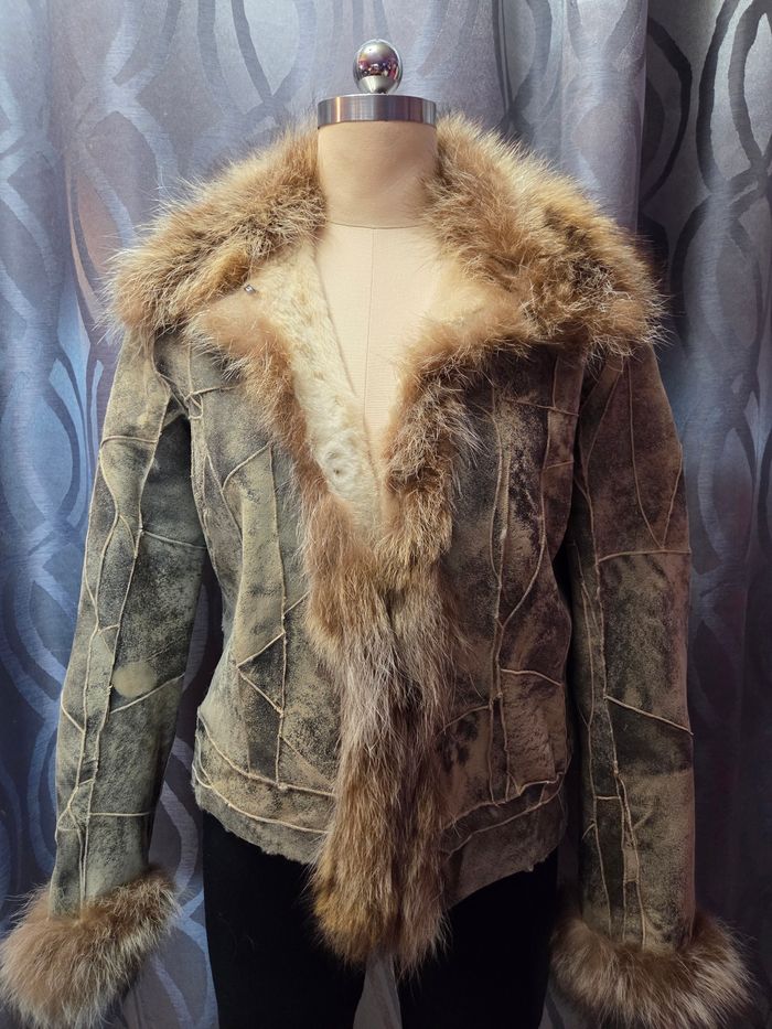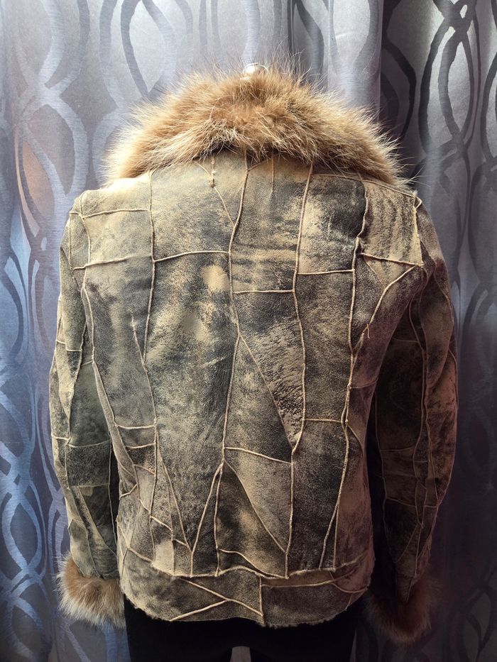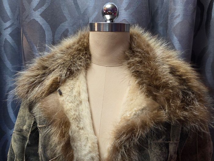 Modèle patchwork en peau lainée avec finitions en fourrure longue sur le col, l’avant et les poignets.
