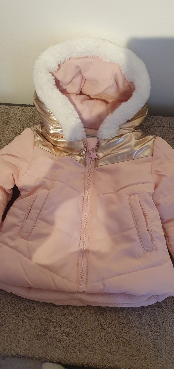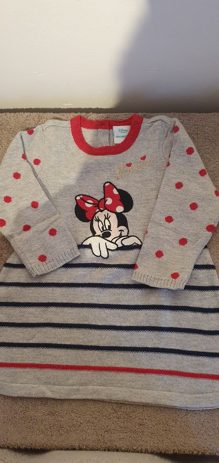 Très joli lot de vêtements 9 mois et parfait état Comprenant * 3 article neufs: - 1 doudoune très belle rose et or doublée polaire - un pantalon molletonné rouge et or - 1 robe en laine Minnie *8 articles en très bon état : - 5 bodies - 1 très belle Turbulette - 1 pull à col gris - 1 bonnet