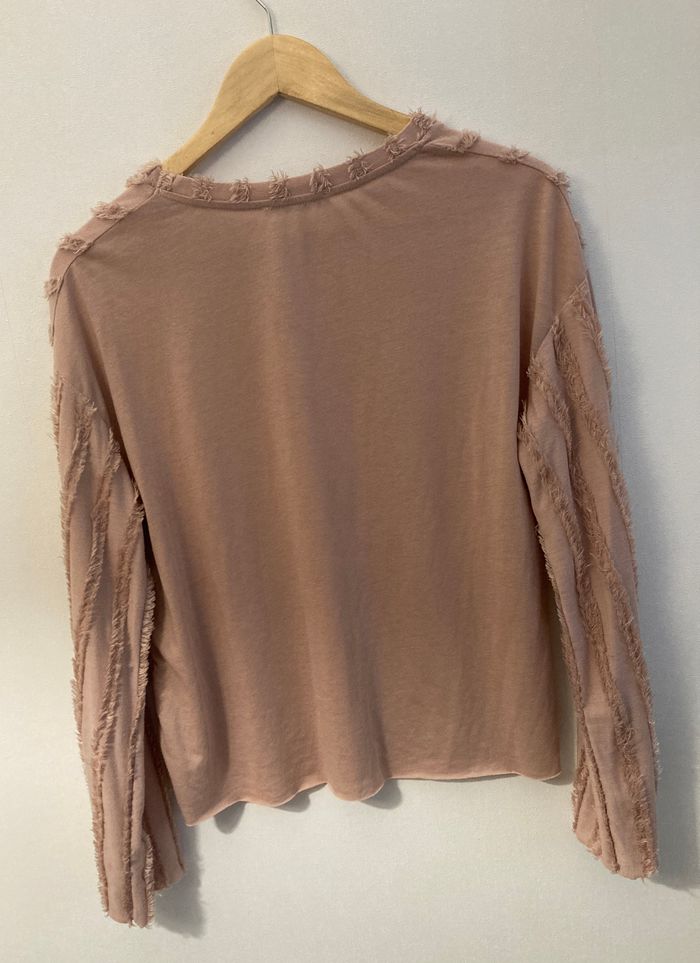 taille S largeur au niveau des aisselles 50 cm hauteur 56 cm matière douce et confortable impeccable couleur vieux rose comme photos 1,2,6