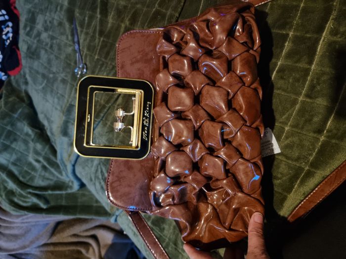 Sac à main avec lanière pour le porter à l'épaule Tiang Kiang marron et doré de 26 cm de haut. Lanière non réglable. Neuf sans étiquettes. Négociable.