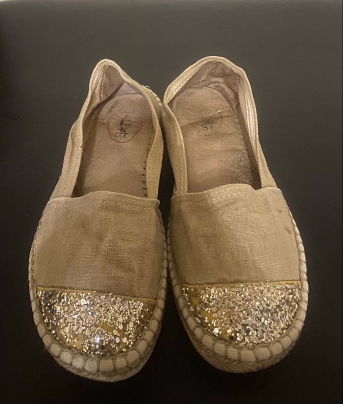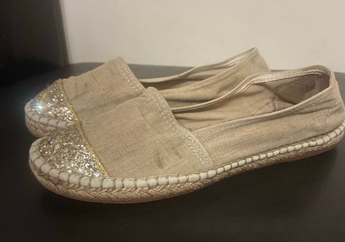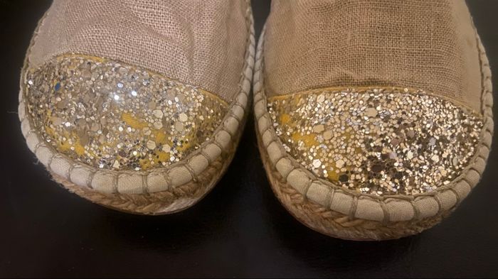 Espadrilles »KST »beiges et dorées,taille 38. Je les ai mises en satisfaisant car elles comportent des tâches sur la chaussure gauche et quelques paillettes sont parties. Si vous avez le moindre doute,n’hésitez pas avant achat de me demander les mesures ou renseignements, pour éviter tous désagréments. PS:Tous les vêtements sont lavés et repassés, avant chaque envoi. 🔥🔥Réduction sur les lots activée🔥🔥 -5% de remise pour 2 articles. -10% de remise pour 3 articles. -20% de remise pour 5 articles.