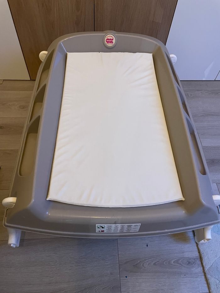 Table à langer Pliable Se fixe sur une baignoire, lit bébé, table ,, idéale quand peu de place Petit matelas par dessus avec quelques marques de point de fixation (voir photo) sans gravité Elle est équipée de pieds pliables et réglables pour se positionner sur la baignoire. Équipée de compartiments de rangement latéraux. Poids maximum de l'enfant : 11 kg. Dimensions hors tout avec pieds de support fermés : L 68 x H 20 x P 80 cm Pour une utilisation sur le lit : mesure extérieure entre les côtés de 63 cm à 73,5 cm. Pour une utilisation sur la baignoire : dimension interne maximum 74 cm Pour une utilisation sur la table : dimension minimum requise pour un bon support 67 cm x 85 cm Utilisation du plat sur la baignoire : dimension intérieure minimum de la baignoire 56 cm, maximum 74 cm Remarque : Cette table à langer ne peut pas être placée sur des baignoires de toutes formes. La table à langer peut être placée sur des baignoires rectangulaires qui ont de longs côtés parallèles et une bordure d'au moins 4 cm