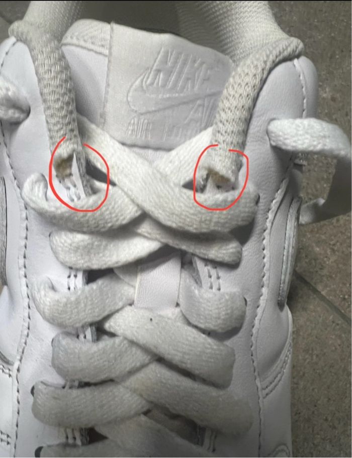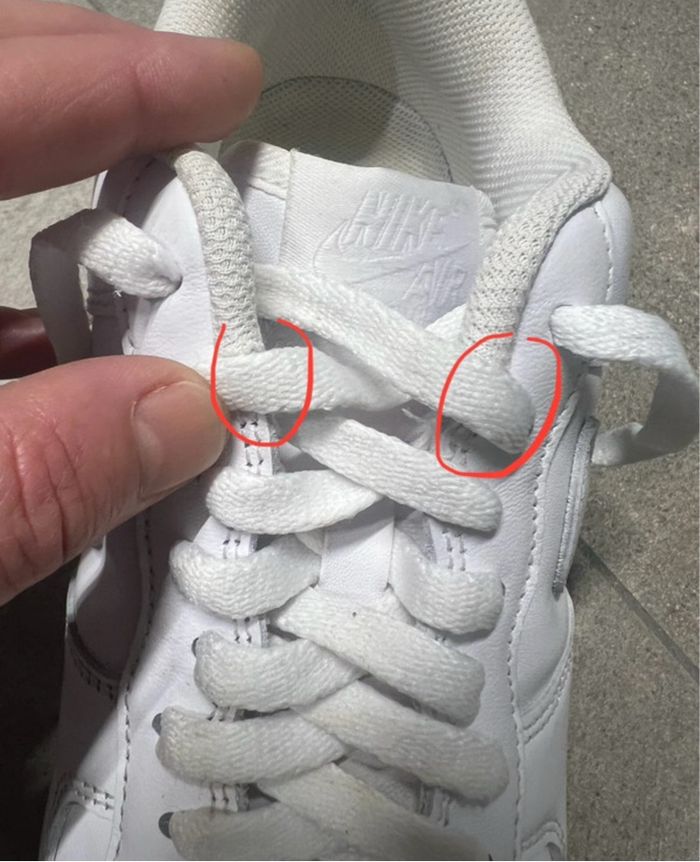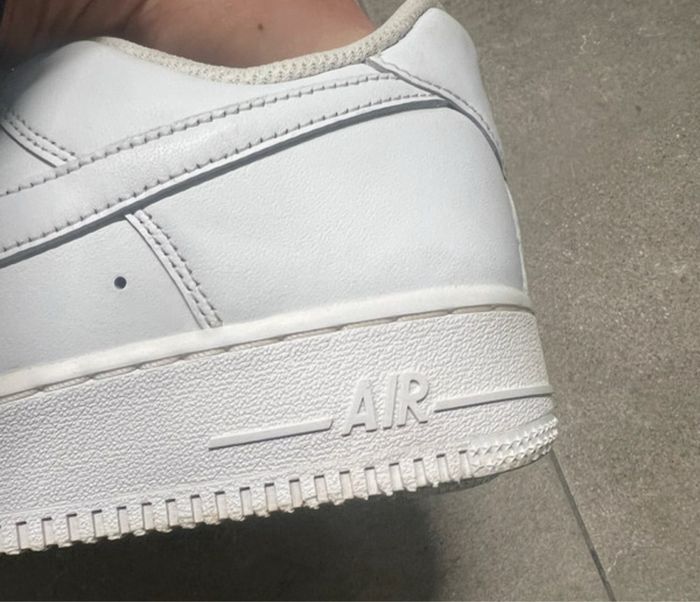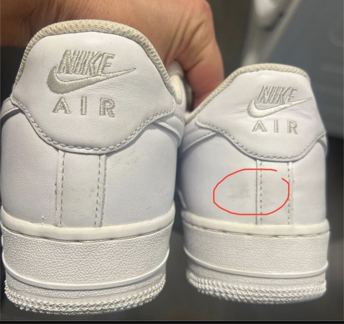 Basket Nike Empeigne en cuir et la plaque "AF1 Bon état général • Légère usure du tissu sur une chaussure près du haut de la languette (voir cercles rouges sur la photo) mais ne se voit pas une fois les lacets mis (photo avant/après) • Talon : Une légère marque/éraflure à l'arrière d'une des chaussures (voir cercle rouge sur la photo) Vendu sans boite d'origine