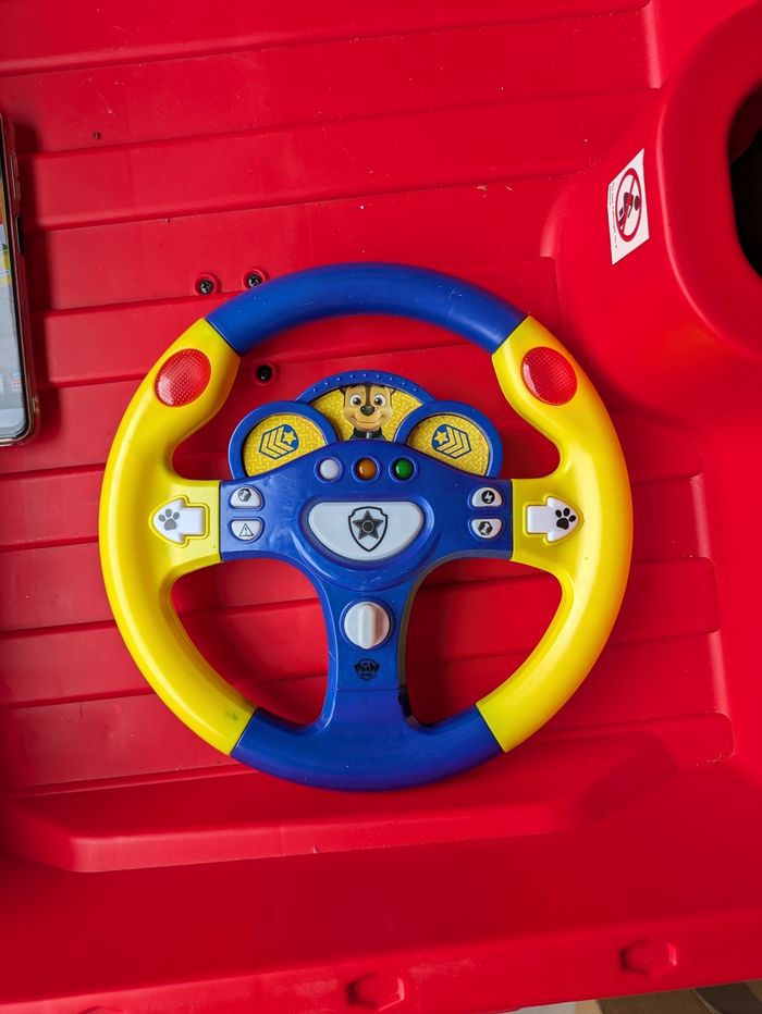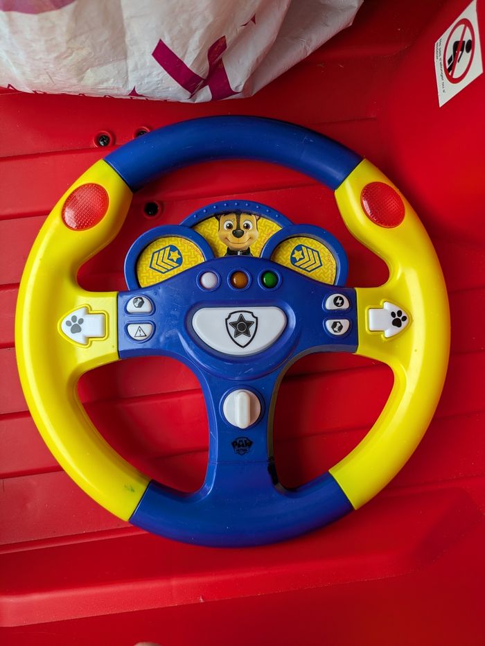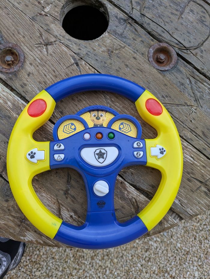 Volant enfant pat patrouille en très bon état très peu servi juste une petite trace en bas à gauche (voir photo ) les deux voyants sur chaque côté s'allument ceux du milieu ne sont pas prévus pour s'allumer. Appui sur les touches différents bruits (police, bruit de freins, klaxon) les piles ne seront pas fournies.