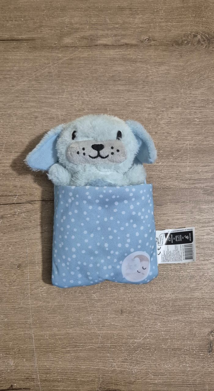 Peluche chien dans son sac de couchage Neuf