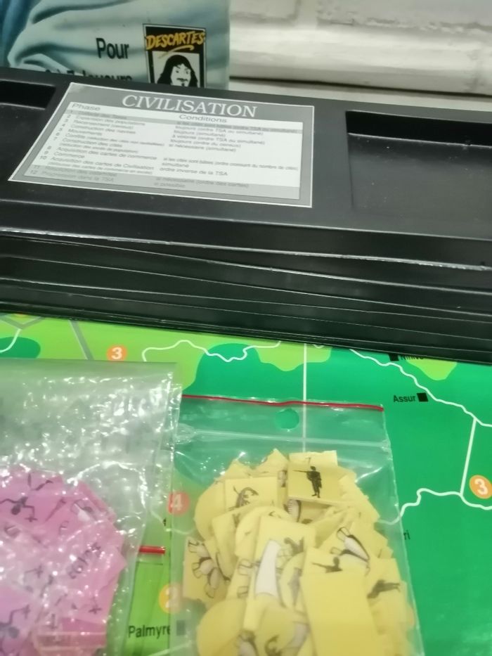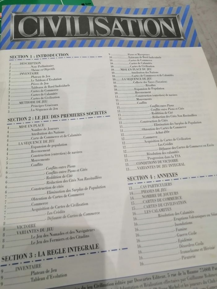 Jeu de Stratégie pour 2 à 7 joueurs de 14 ans et plus des éditions Jeux Descartes. Complexité faible à moyenne (selon le niveau de jeu choisi), mauvaise jouabilité en solitaire. Vous êtes à l'aube de l'histoire, l'agriculture est sur le point d'être inventée, bientôt les cités naîtront, le commerce se développera, les peuples découvriront la culture, la science, la politique, l'économie. Entre - 8.000 et - 250 avant J.C., du Néolithique à l'Age du Fer, vous devrez mener votre société pour en faire une grande civilisation! Le but du jeu est d'être le premier à amener sa société à un niveau général de civilisation basé sur des facteurs tels que l'économie, la culture, la politique,... Le vainqueur est le joueur qui aura su établir le meilleur équilibre entre ses nomades, ses fermiers, ses citoyens, ses marchands, ses aventuriers,.