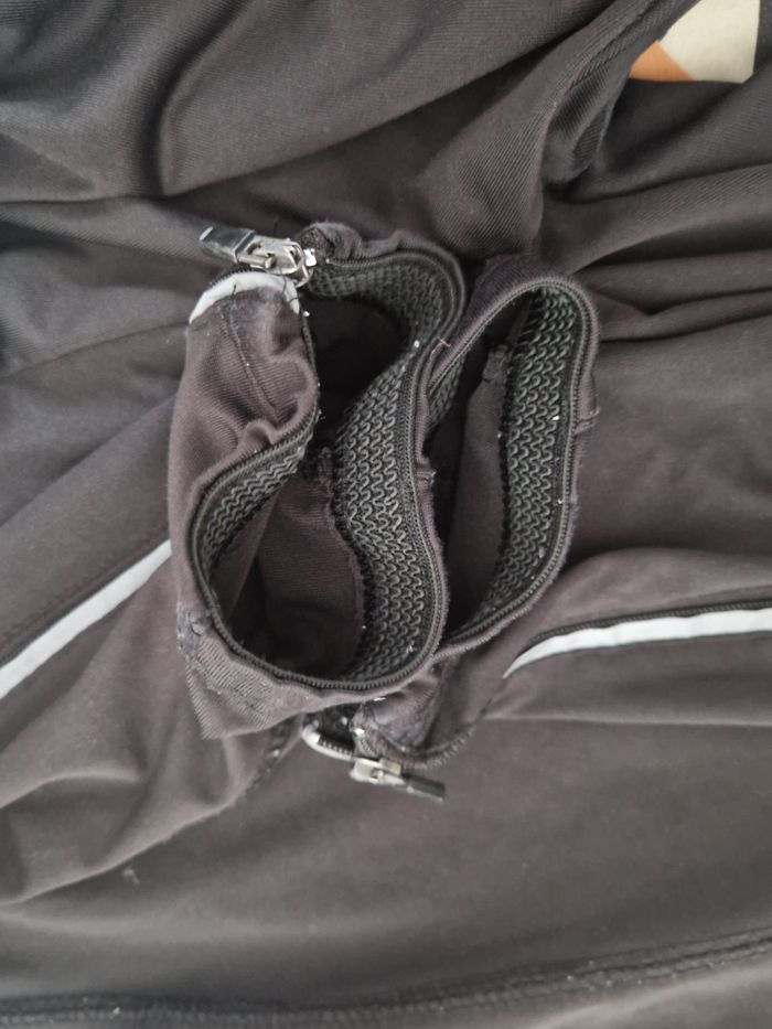 Fermetures zippées aux chevilles + cordon de serrage à la taille.