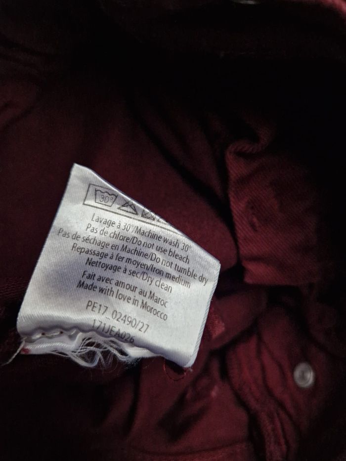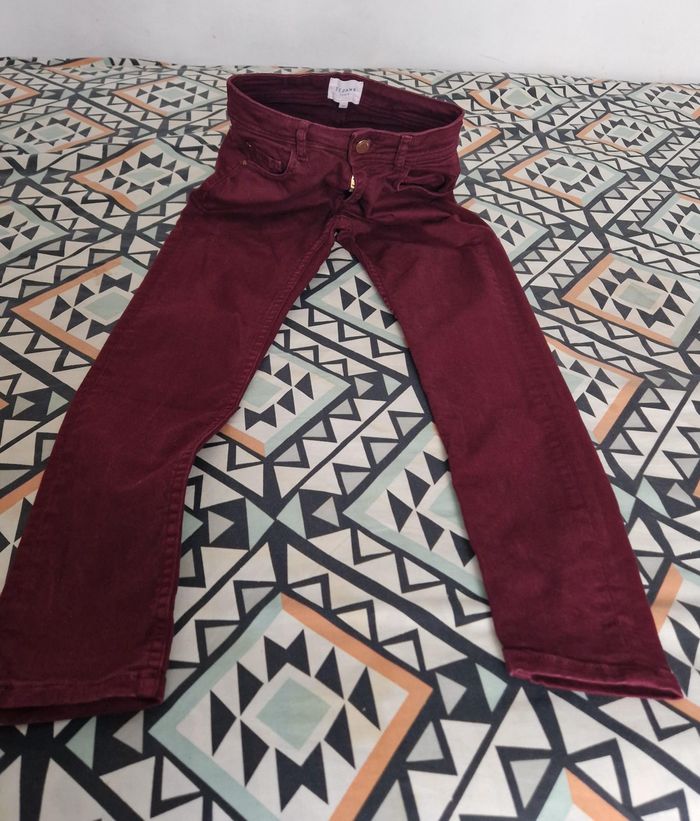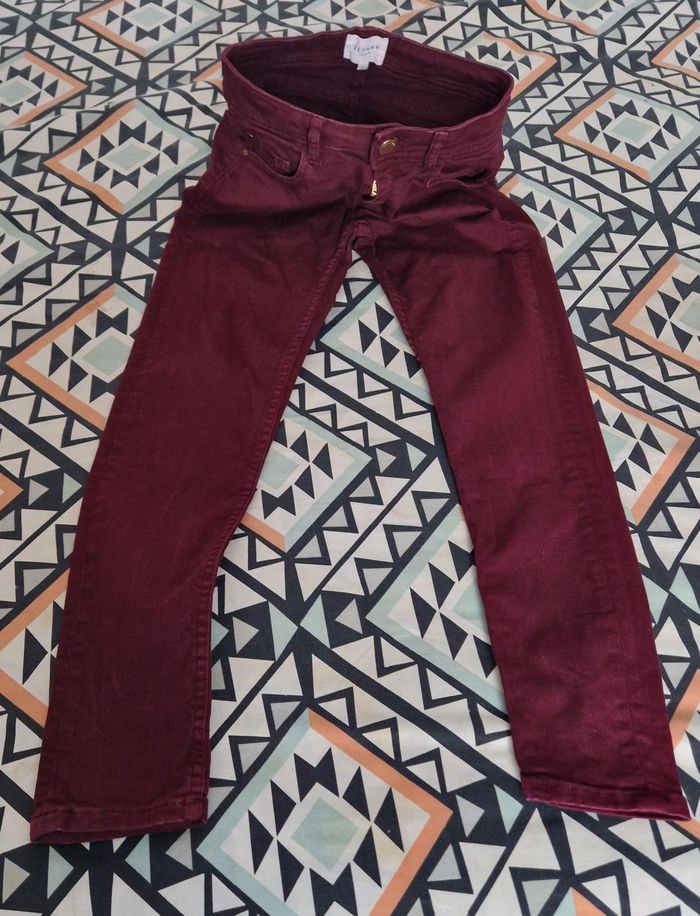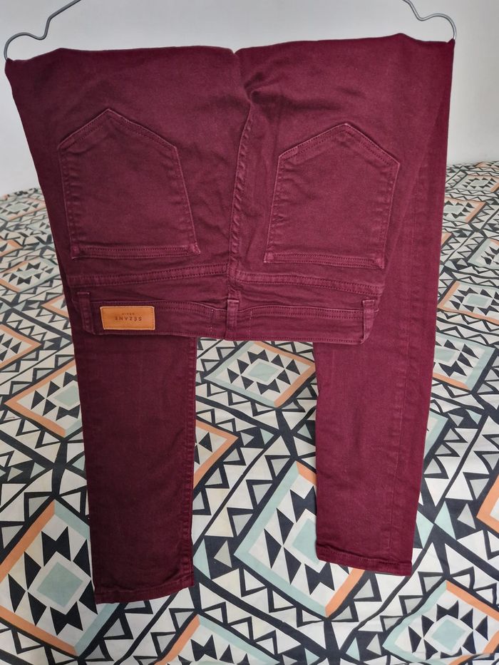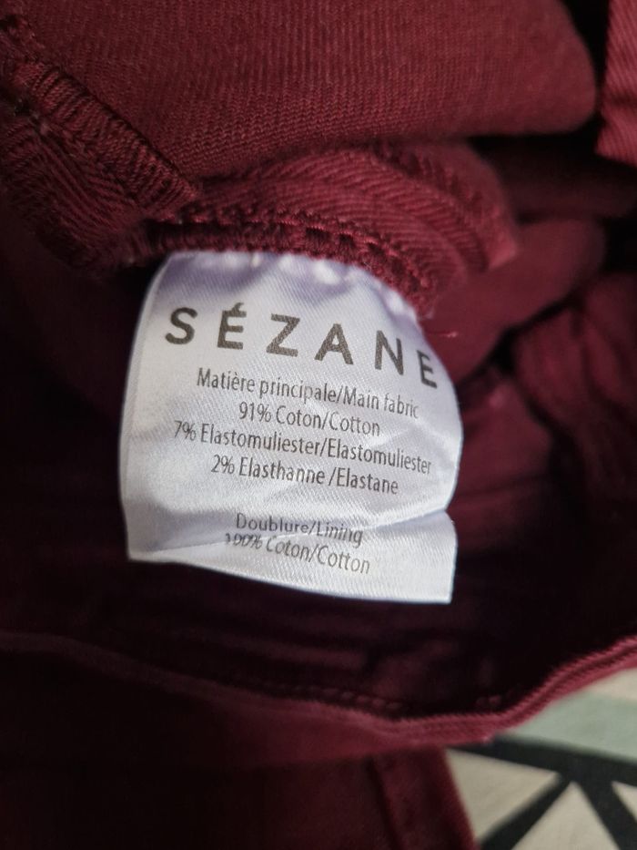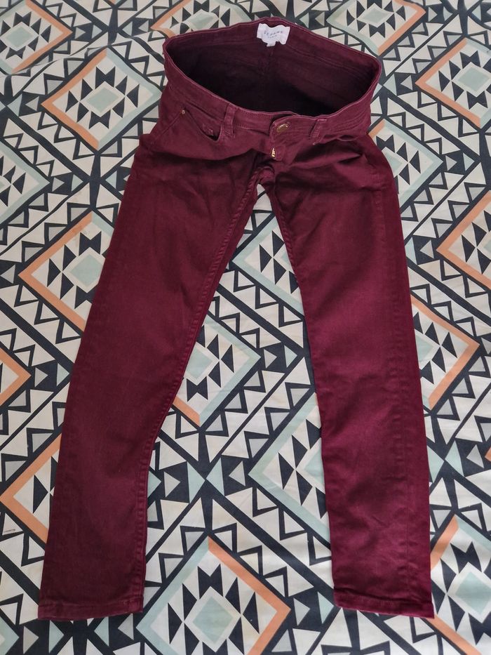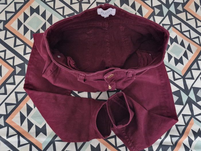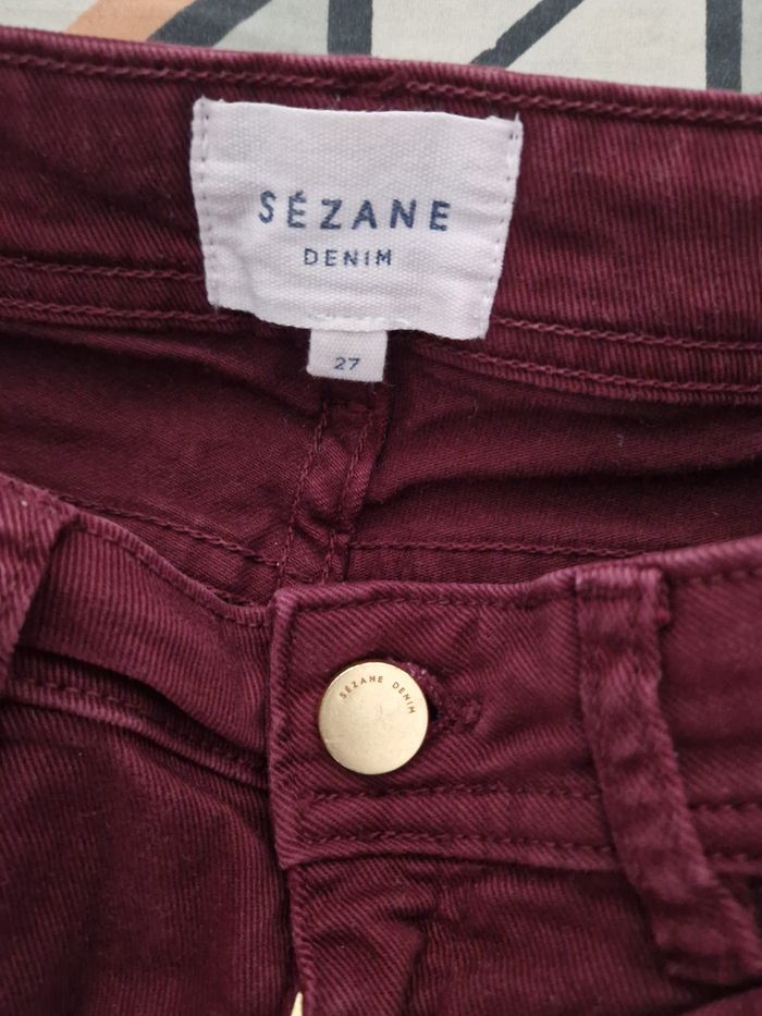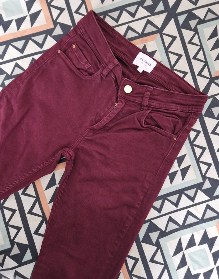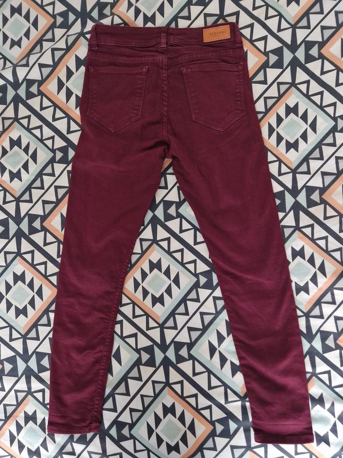 Magnifique jean Sézane couleur bordeaux, coupe slim et matière confortable grâce à l’élasthanne.