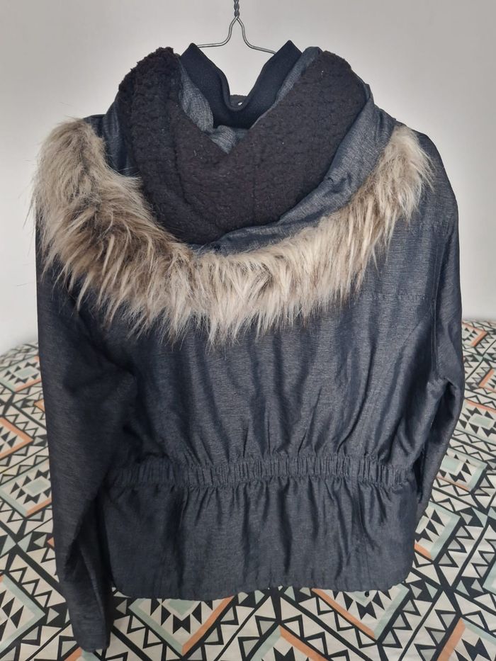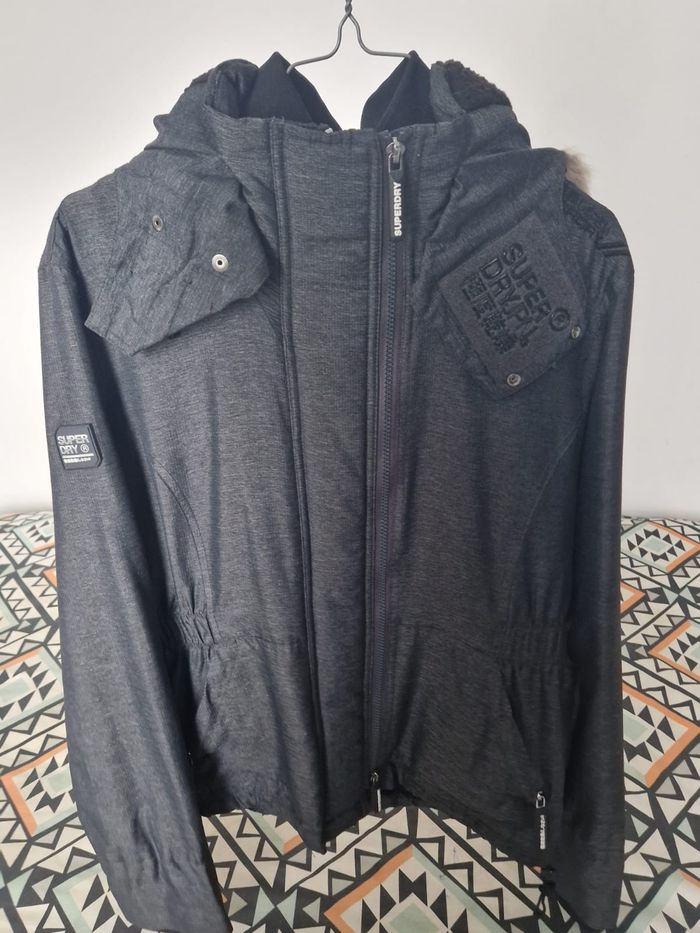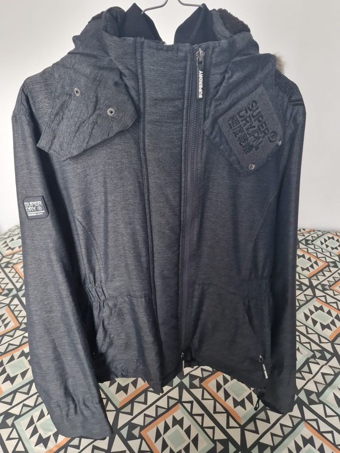 Coloris gris anthracite, intérieur entièrement doublé en polaire épaisse, capuche avec fausse fourrure, multiples détails brodés Superdry.