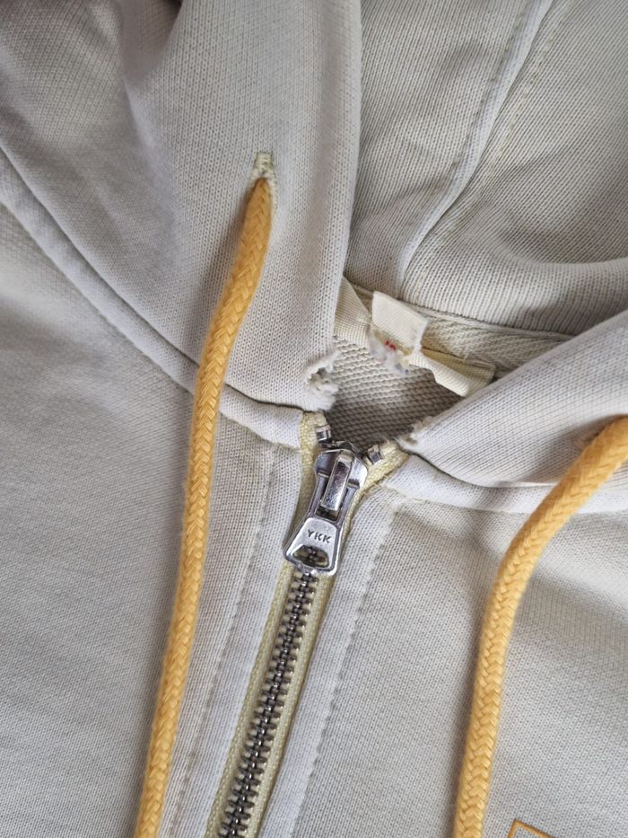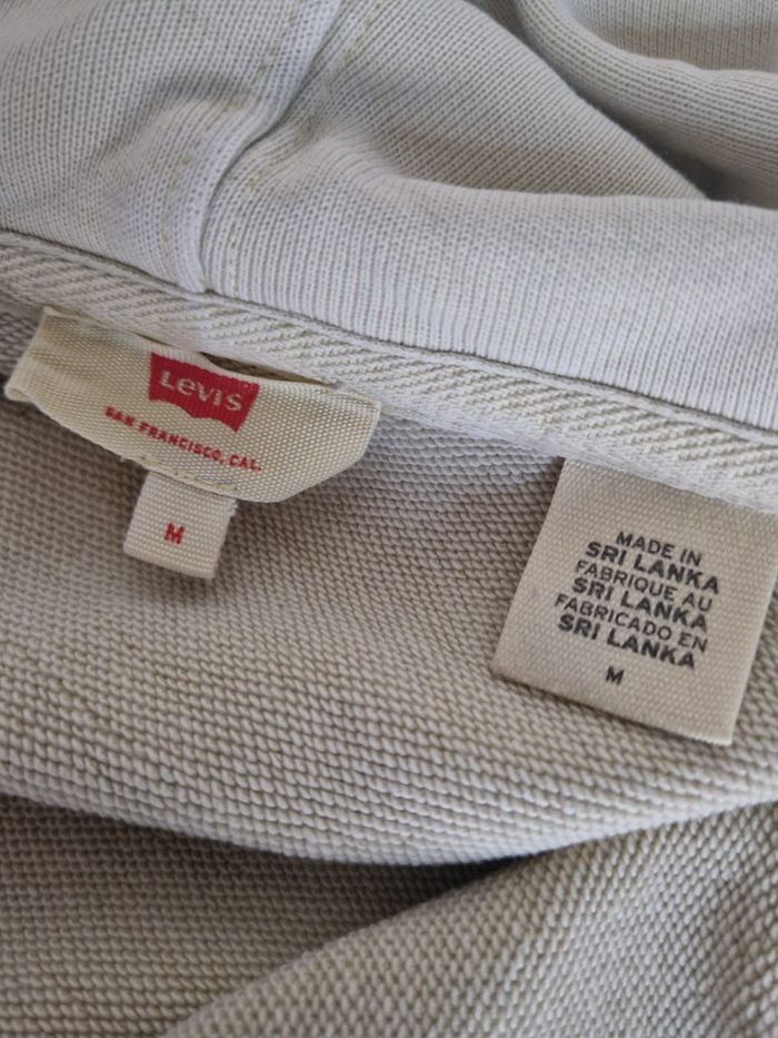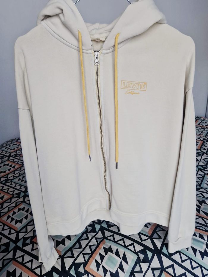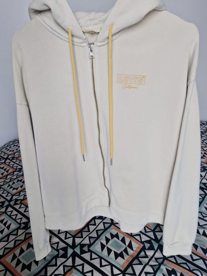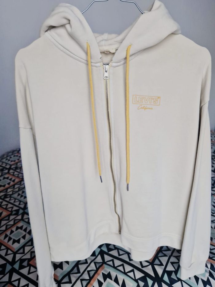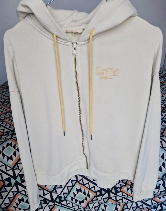 Joli sweat à capuche Levi’s, coloris beige crème, logo Levi’s California brodé en jaune, cordons contrastés.