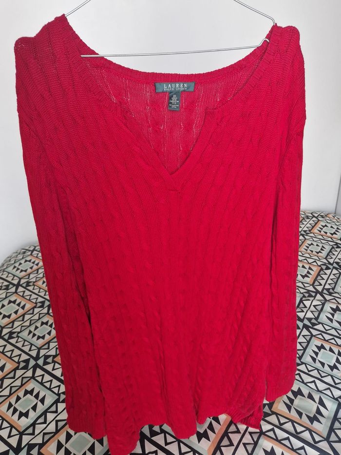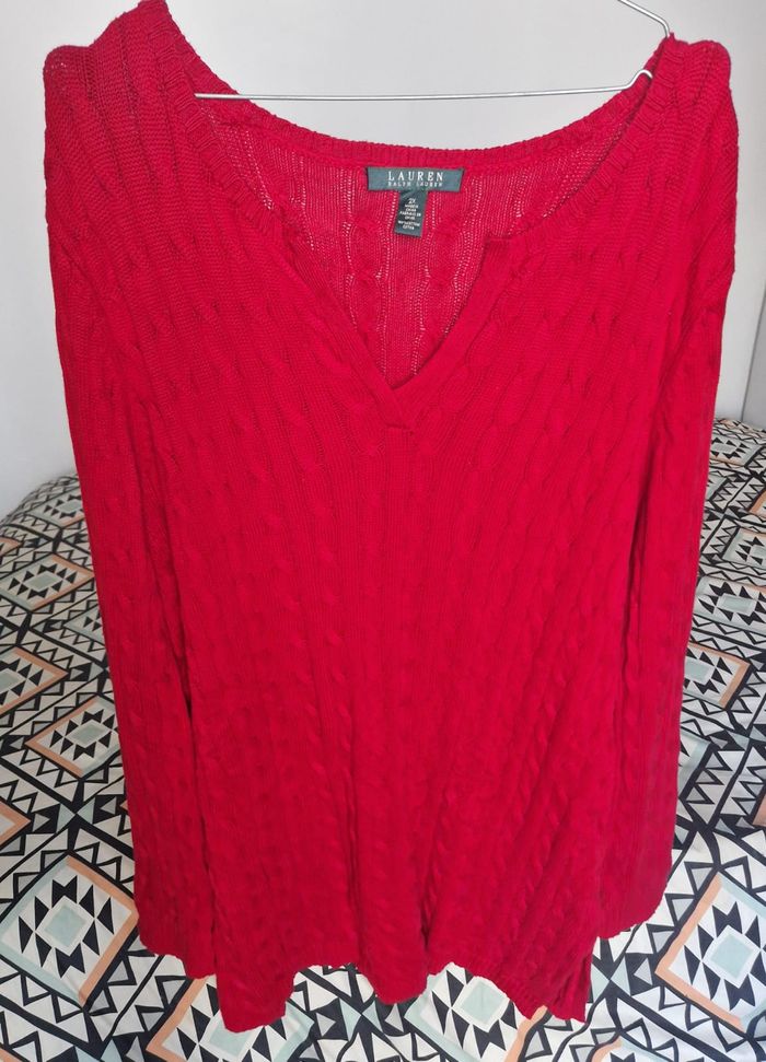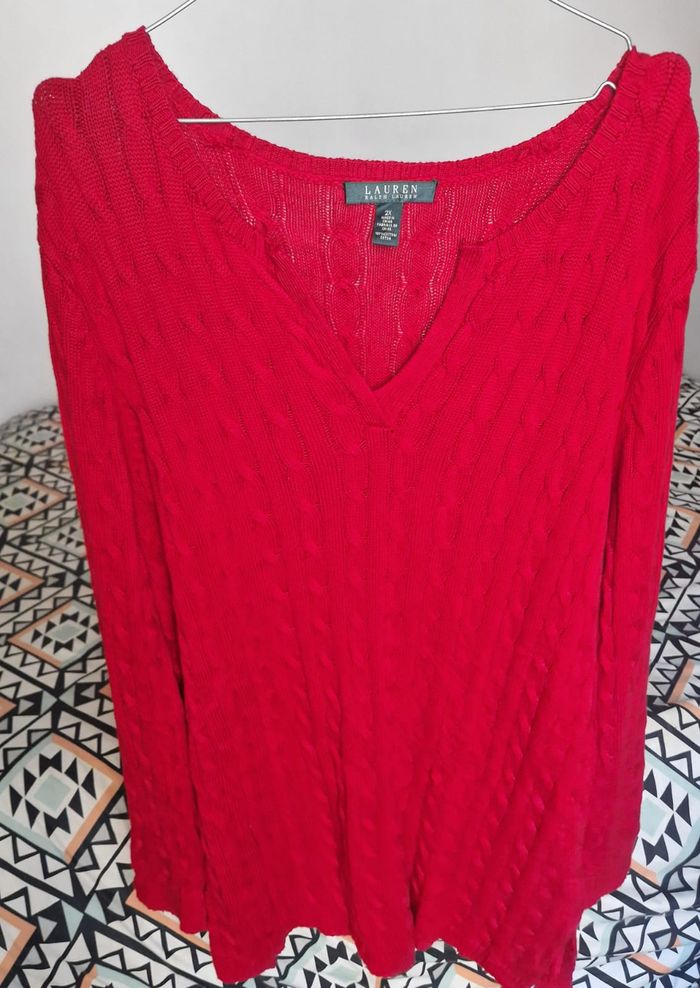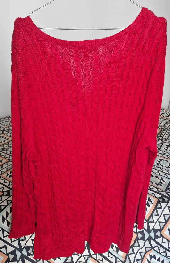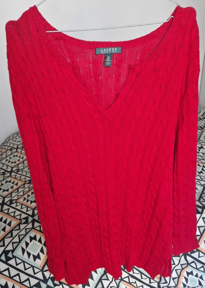 Superbe pull long Lauren Ralph Lauren, coloris rouge vif, en maille torsadée 100 % coton.
