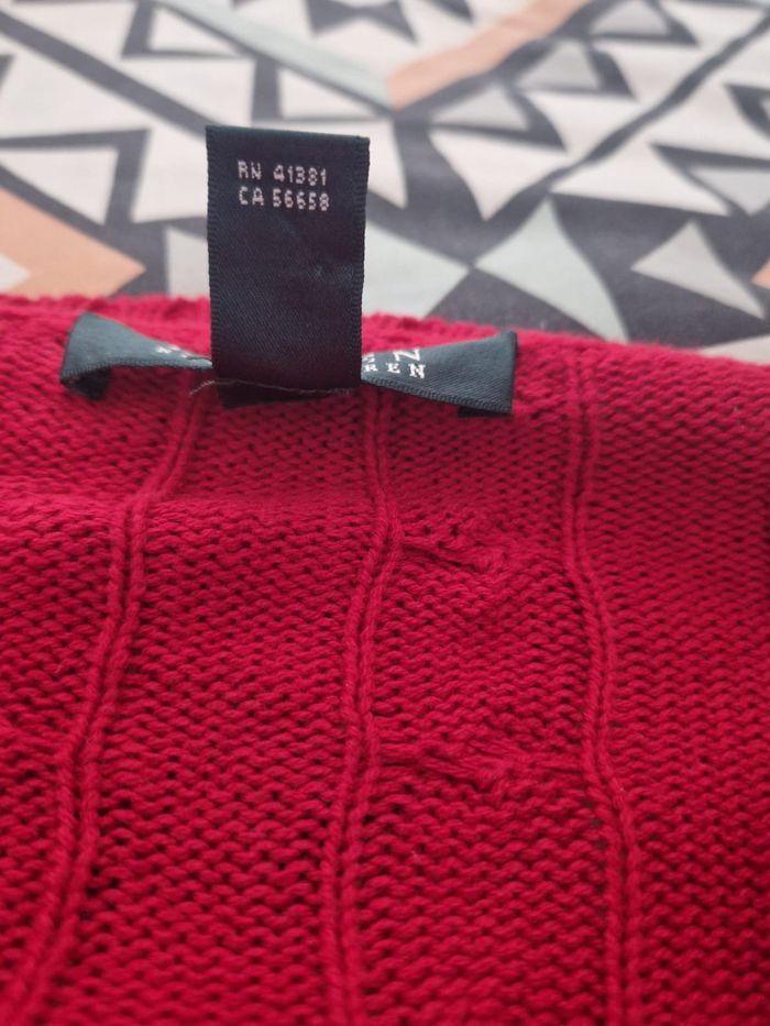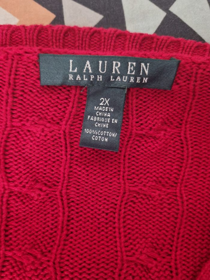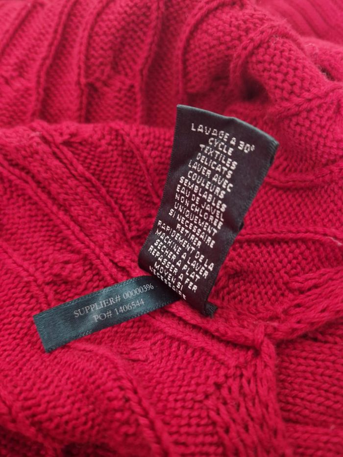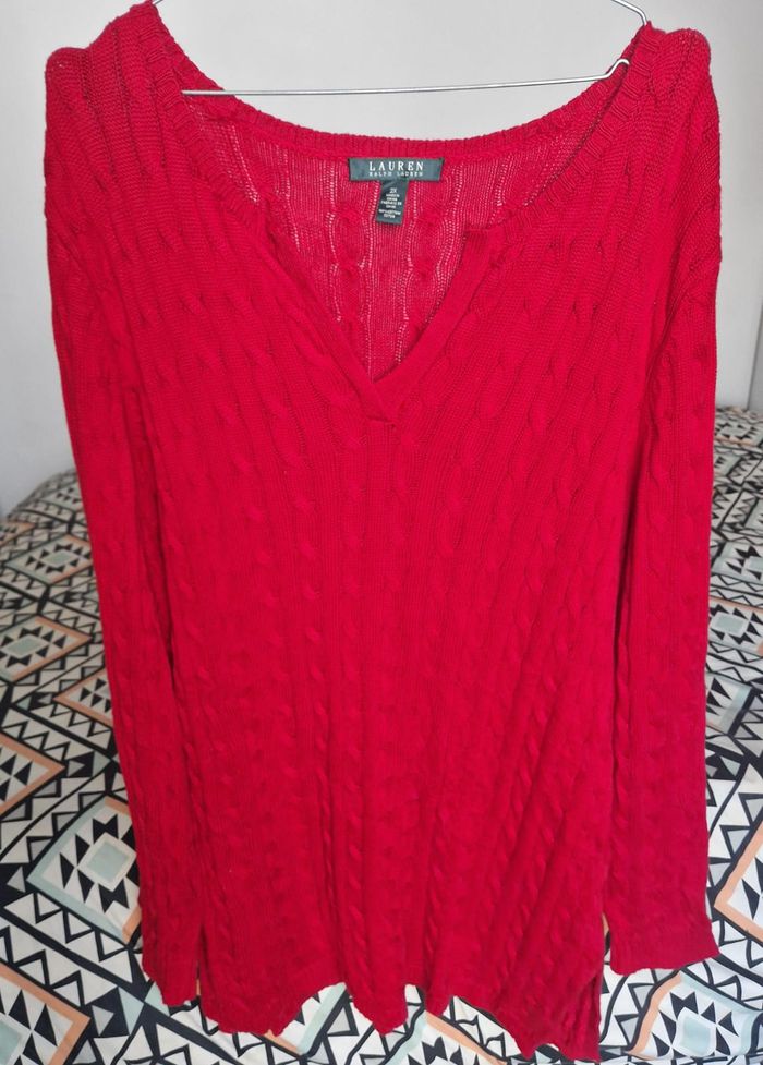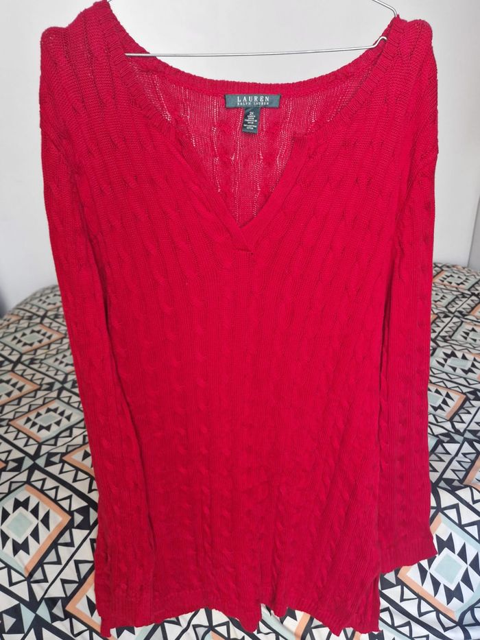 Superbe pull long Lauren Ralph Lauren, coloris rouge vif, en maille torsadée 100 % coton.