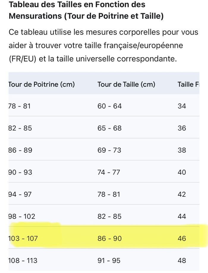 Mesure d’aisselles à aisselles:52cm=104cm de tour de poitrine.