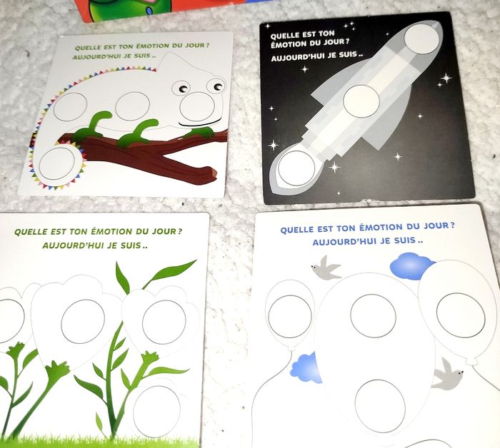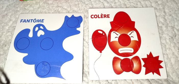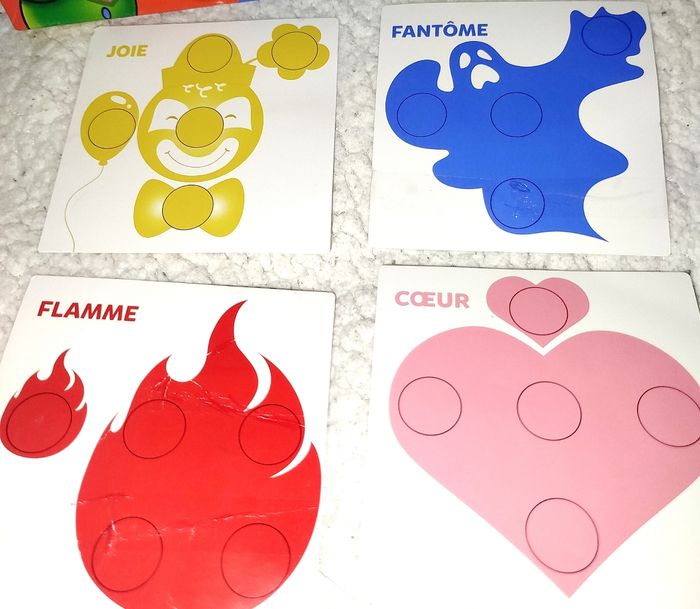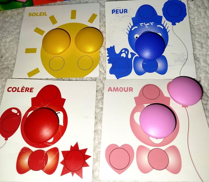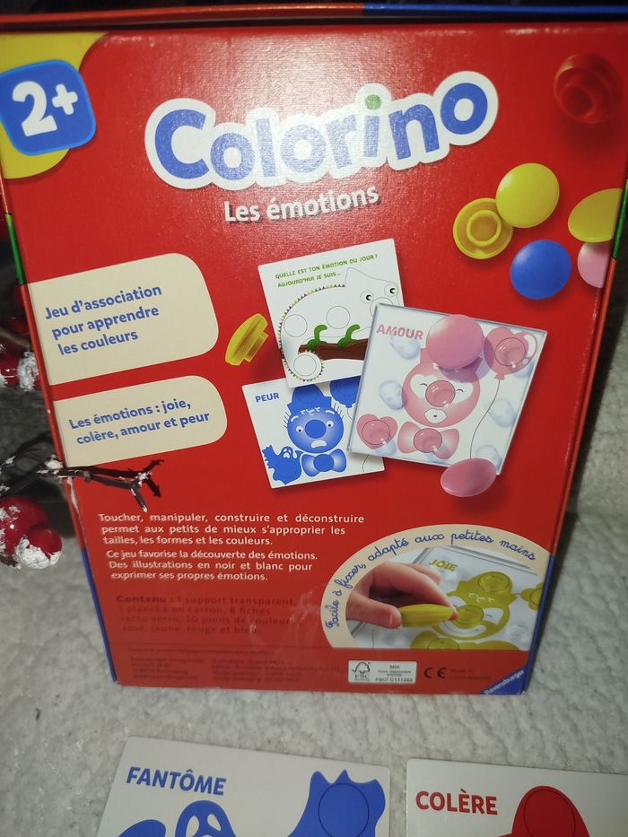 🎄 Très bon état ⚠️ A noter 2 petites cartes ont été renforcées avec 1 bande de scotch mais rien n'empêche de jouer avec le petit jeu.. 🟣 Apprendre les couleurs et 4 émotions - Joie, colère, amour, peur sur 8 fiches. Ce jeu des émotions aide votre enfant à les identifier. 🟠Double apprentissage malin - Recto : expressions faciales colorées. Verso : symboles émotionnels. Votre enfant comprend mieux ses sentiments. 20 gros pions colorés spécialement conçus pour être faciles à manipuler par les petites mains. Idéal pour développer la motricité fine.