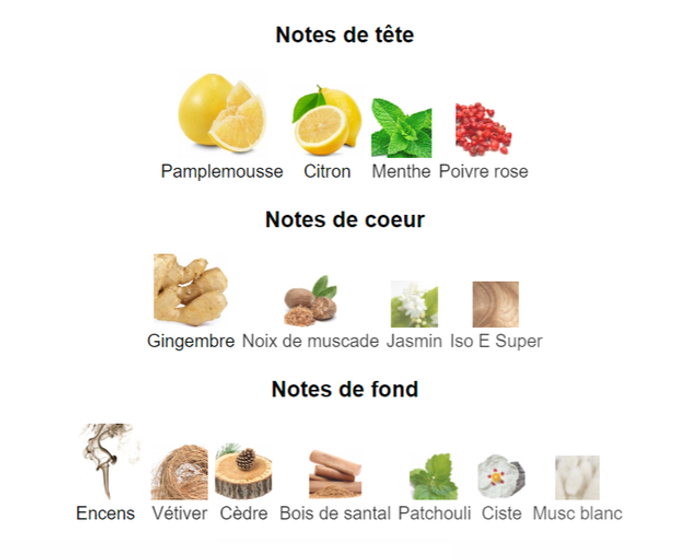 Notes de tête : pamplemousse, menthe, poivre rose, noix de muscade, gingembre, cèdre, jasmin, vétiver