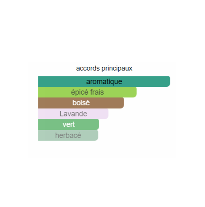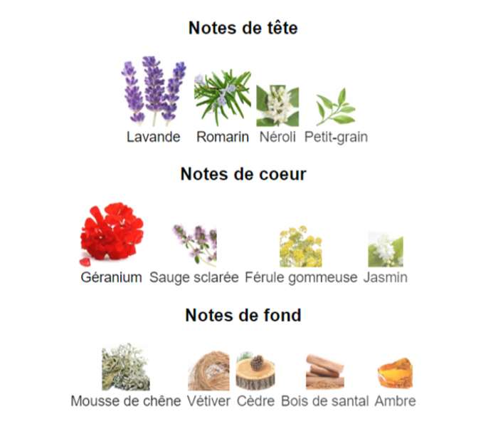 Les notes de tête sont Romarin, Lavande, Néroli et Petit-grain;
